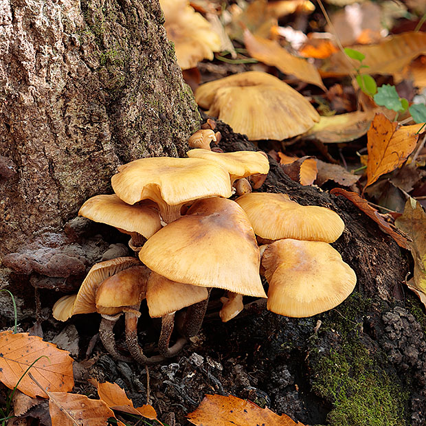 晩秋に枯れ木から束になってはえるきのこです。 ナラタケモドキに似ています。 ナラタケは柄の途中に付着物がありますが、 ナラタケモドキは柄の途中に付着物がありません。
