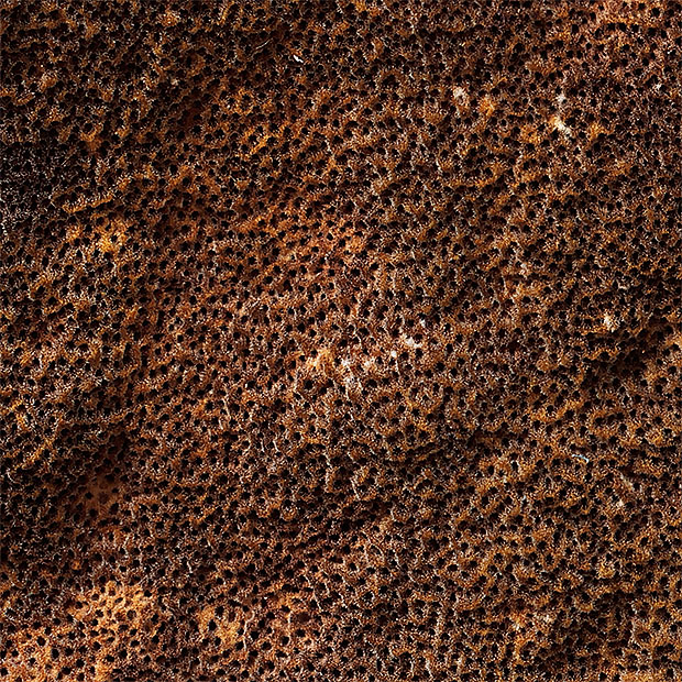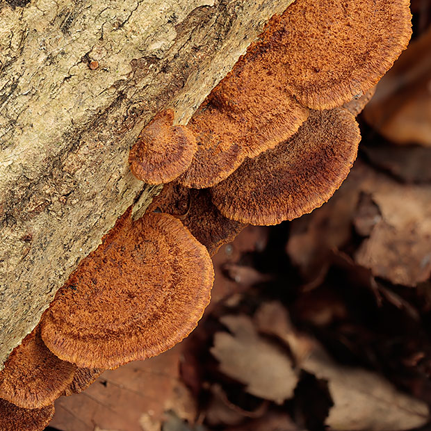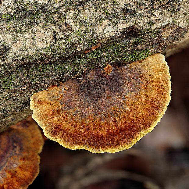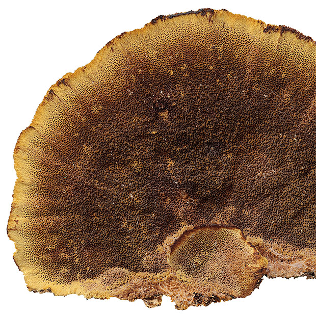 柔軟性のとぼしい乾いた粘土質をおびたかたいきのこです。 若いときの傘の周辺部は、 マスタードのような黄色をおびています。 肉は黄褐色です。