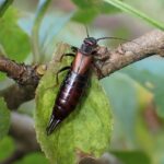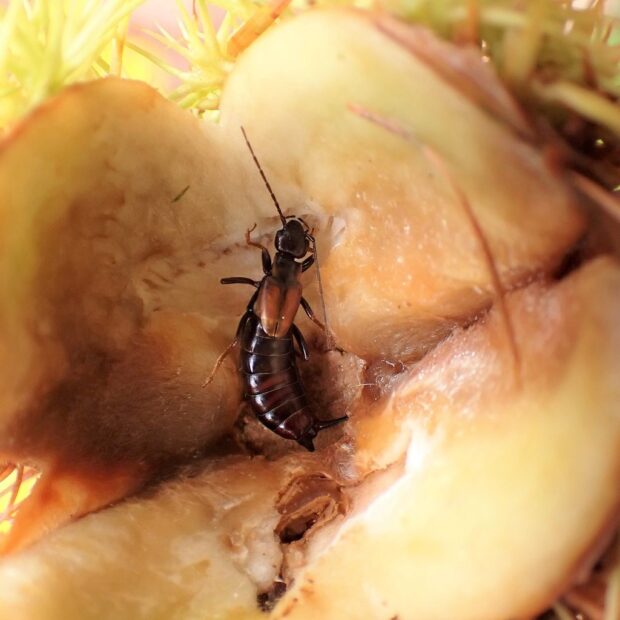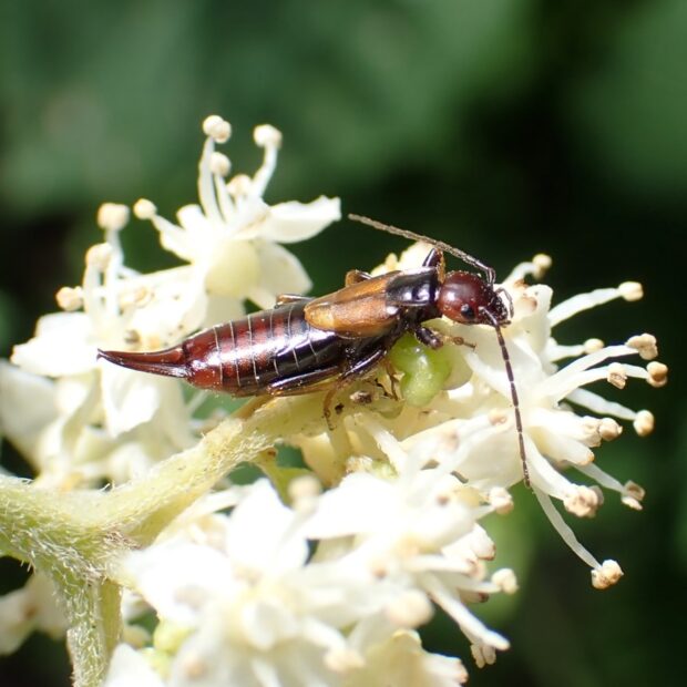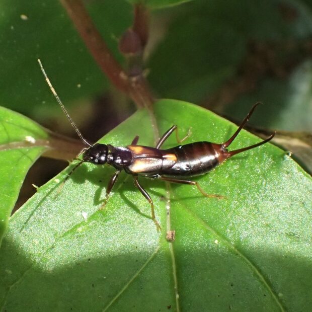 山地性のクヌギハサミムシの仲間。 体は赤褐色で、 前ばねが黄色っぽく、 はさみが細長いタイプとふと短いタイプがいます。 花にもよくやって来ます。 メスは卵を産んだ後、 ふ化するまで卵を守り続けます。
