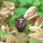 銅色の光沢がある山地性のカメムシ。 前胸の側角(両肩のつき出たでっぱり)が鋭くとがるのが特徴です。 山のいろいろな植物で普通に見られます。