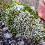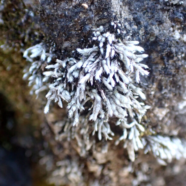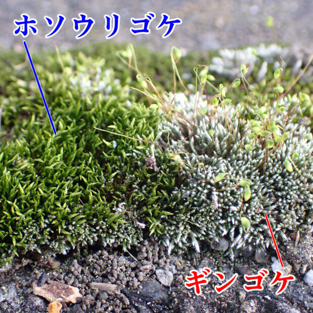 都会でもごくふつうに見られる身近なコケ。 葉の上半分に葉緑体がないため白っぽく見えます。 住宅近くの石垣、 道路のすき間などに、 白っぽいコケが生えてないか探してみよう!