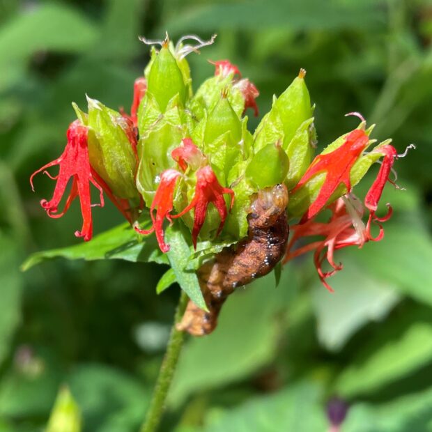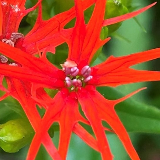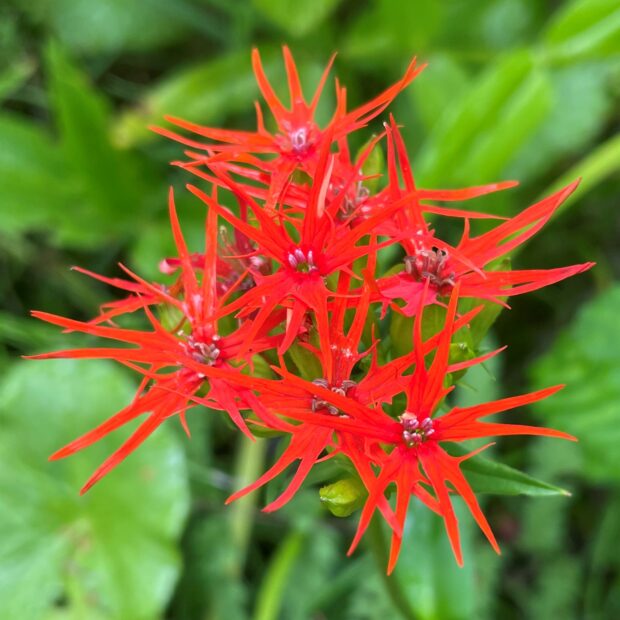 花びらの先が燕(つばめ)の尾のように深く切れこんでいて、 センノウ(フシグロセンノウを参照)によく似ていることから、 燕尾仙翁(エンビセンノウ)と名がつきました。 ごく限られた地域にある絶滅危惧種です。