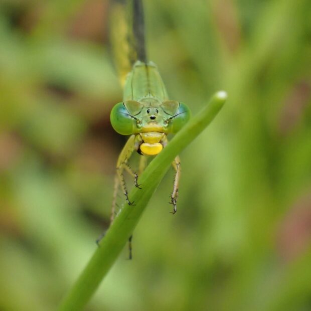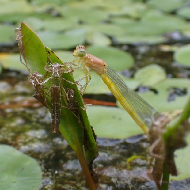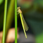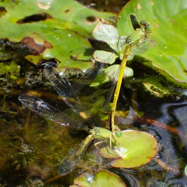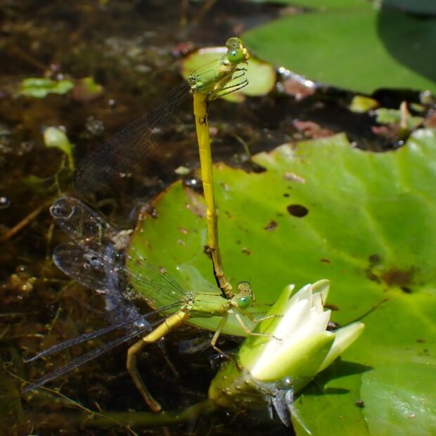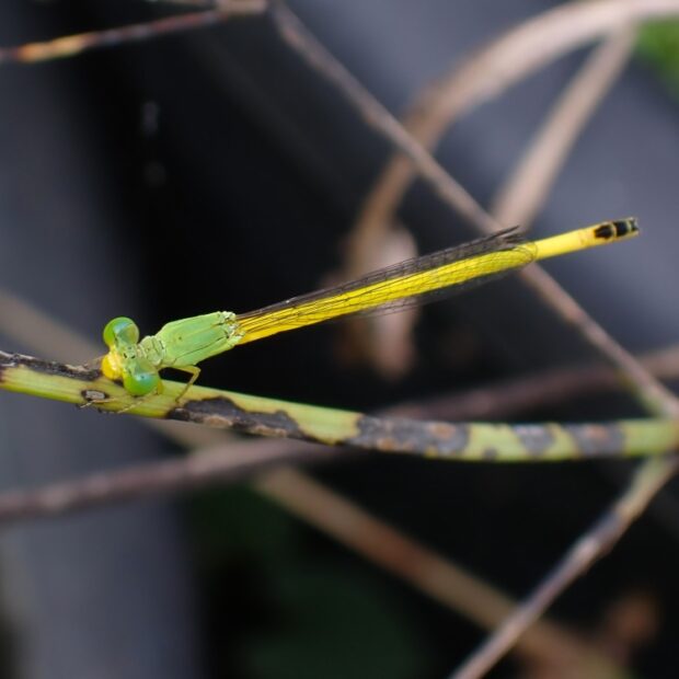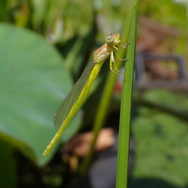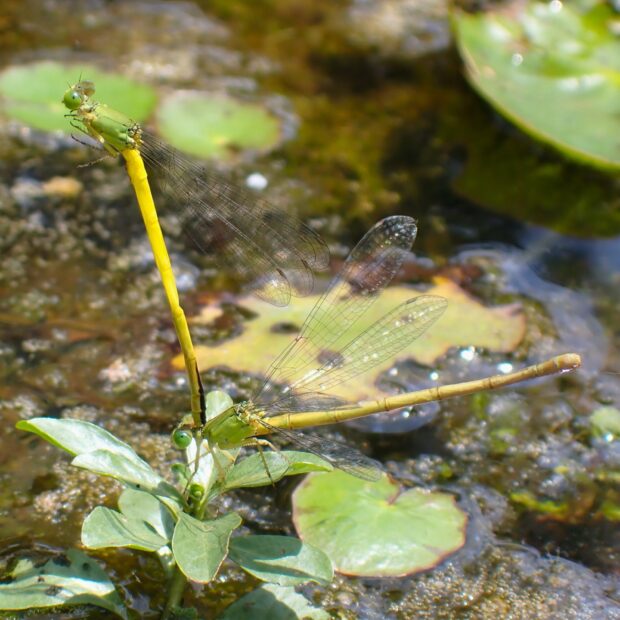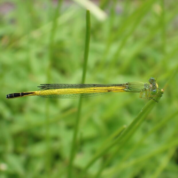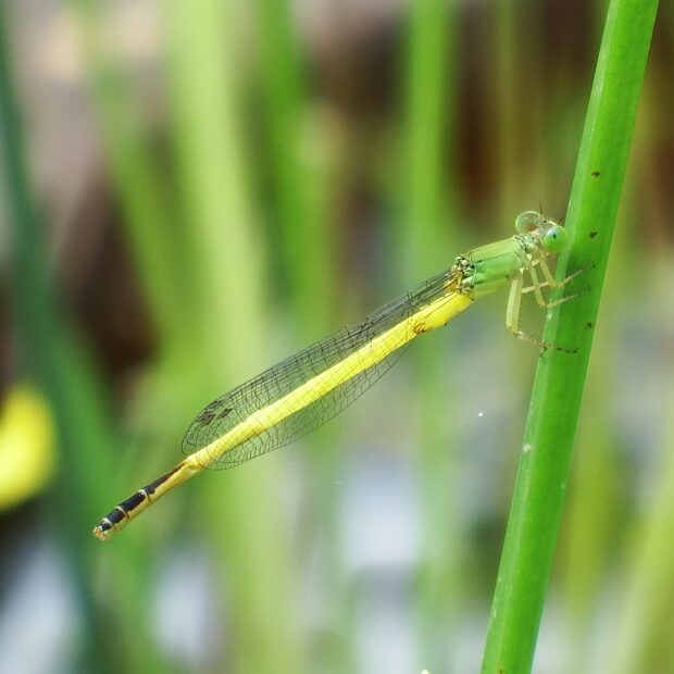 オスメスともに黄色いイトトンボ。 水生植物が茂る池や沼で見られます。 たいへん貪欲で、 小型のトンボを捕えて食べます。 オスとメスが連結したまま水面の浮いた植物に産卵することが多いですが、 メスが単独で産卵することもあります。