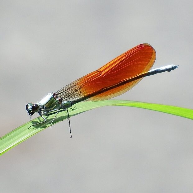 平地~山地の水生植物が茂る清流で見られるカワトンボの仲間。 はねの色は多型で、 オスは橙色、 淡い橙色、 無色の3タイプがあり、 メスは淡い橙色、 無色の2タイプがあります。 アサヒナカワトンボと非常によく似ています。 日本固有種。