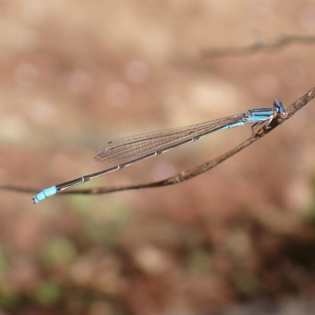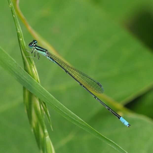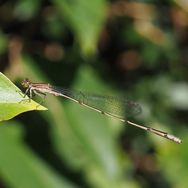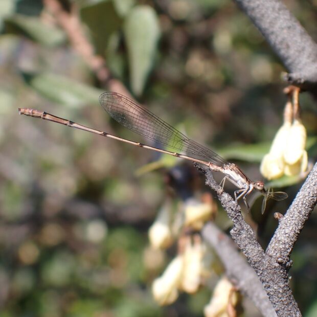 成虫で越冬するイトトンボ。 日当たりのいい池、 沼、 湿地などで見られ、 北へ分布を拡大しています。 1年に2回出現し、 夏型(夏に発生して繁殖)と越冬型(晩夏に発生し越冬し翌春に繁殖)がいます。 産卵は、 オスとメスが連結して、 水生植物の茎や水面に浮いている植物に産卵します。