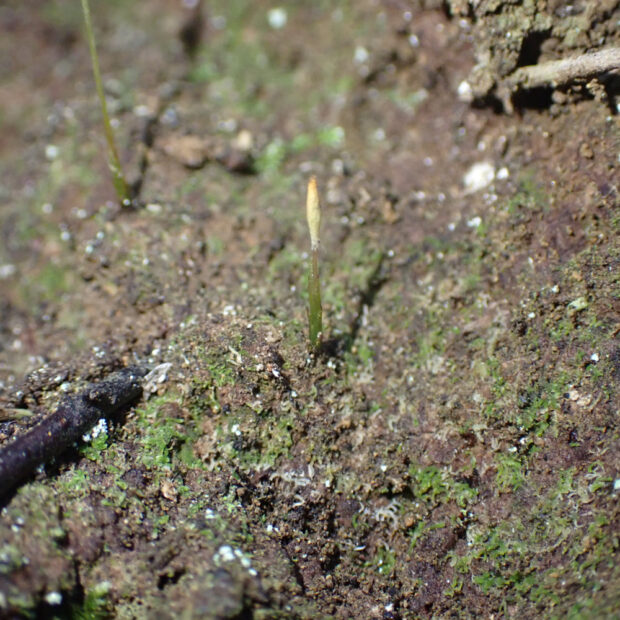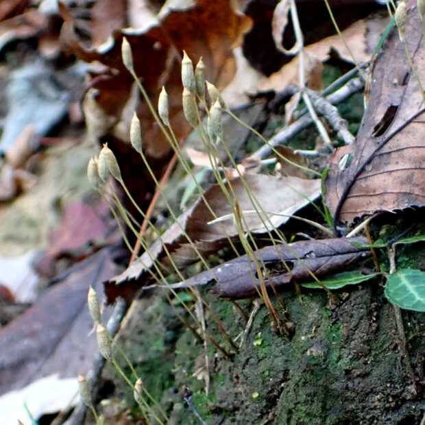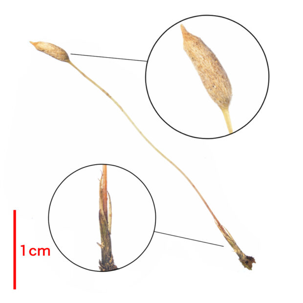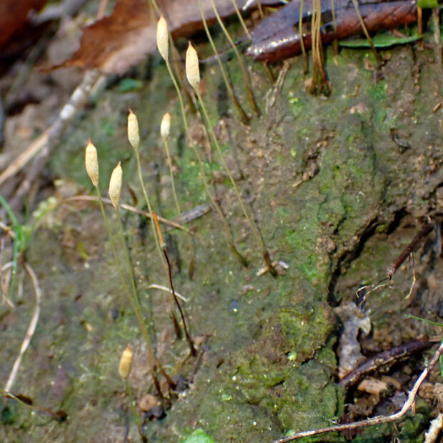 山道の斜面上によく生えているコケ。 「葉見ず」の名の通り葉をほとんど発達させません。 蒴(さく)は大きく、 これで存在を知ることが普通です。 こんな姿ですがスギゴケの仲間です。