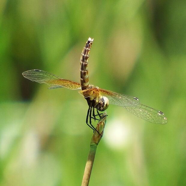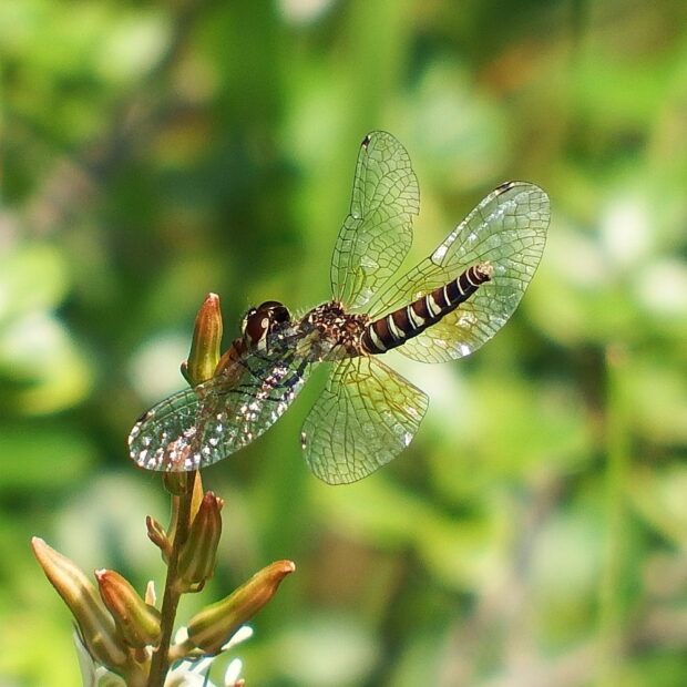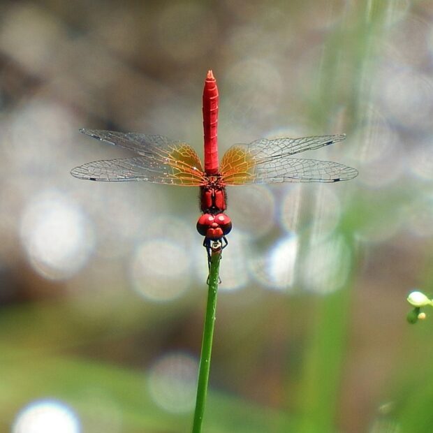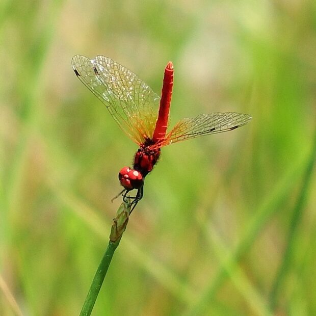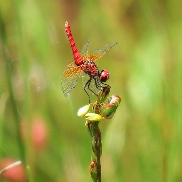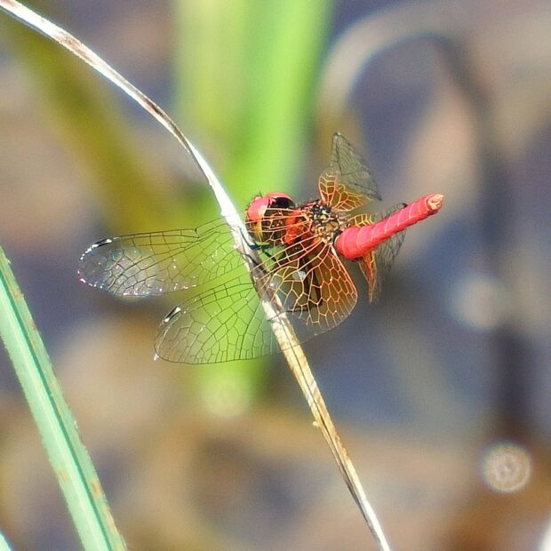 トンボ科の仲間。 世界で最も小さいトンボの一つ。 オスは成熟すると真っ赤になり、 メスは赤くならず、 しま模様。 丘陵地から山地の植物の繁茂する湿地で見られますが、 分布は局所的で減少しているトンボです。