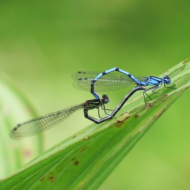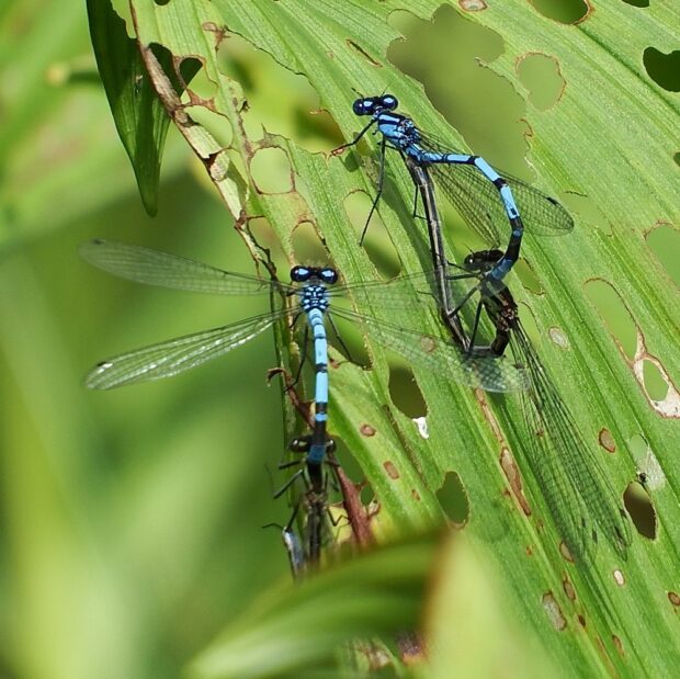 寒冷地に生息するイトトンボ。 本州では高い山の水草が多い池、 沼、 湿原で見られます。 産卵は、 オスとメスが連結またはメスが単独で、 水面近くの植物に行います。 北海道では普通に見られますが、 本州では産地が限られます。