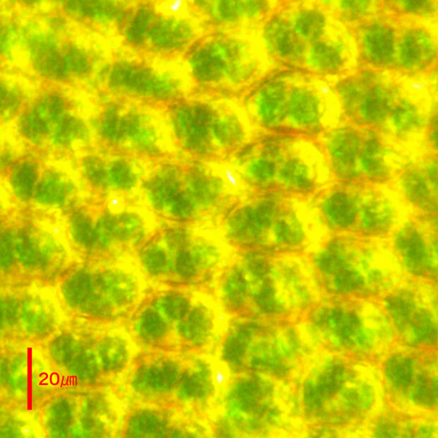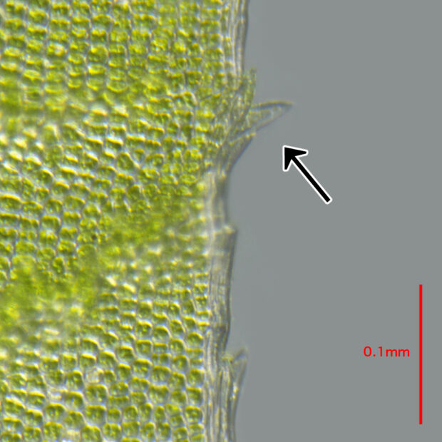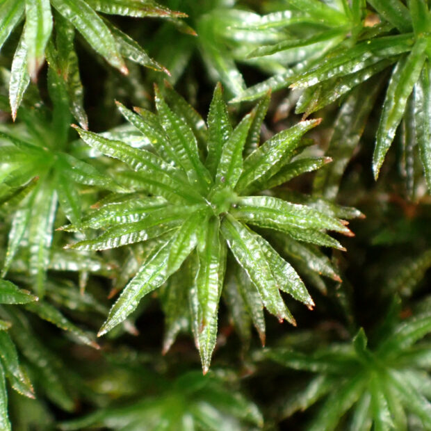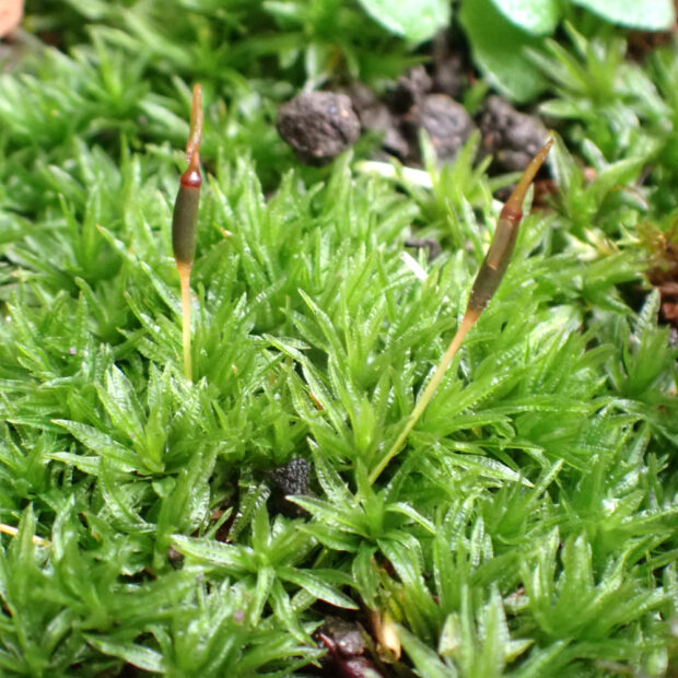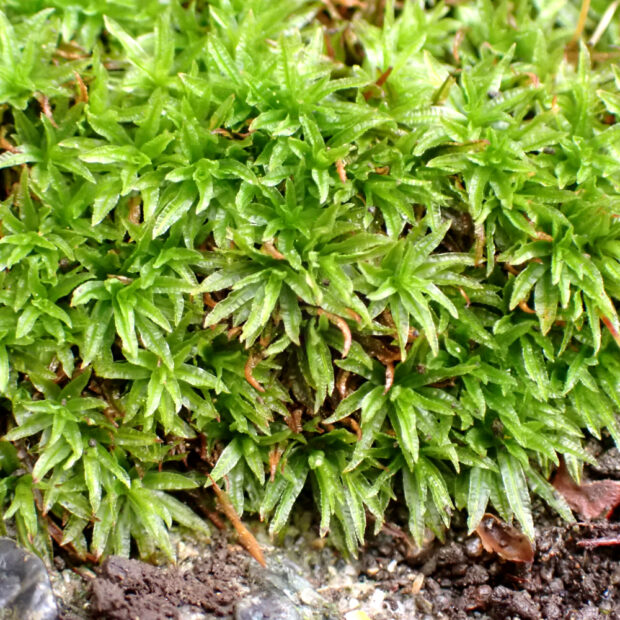道ばたの土上にも生えている身近なスギゴケ科のコケ。 ルーペなどで拡大して見てみると、 葉っぱの表面が波打っているのを観察できます。