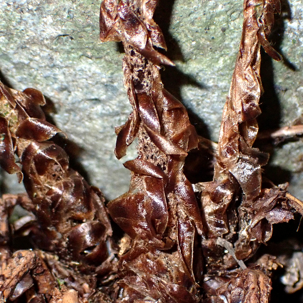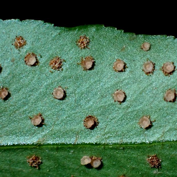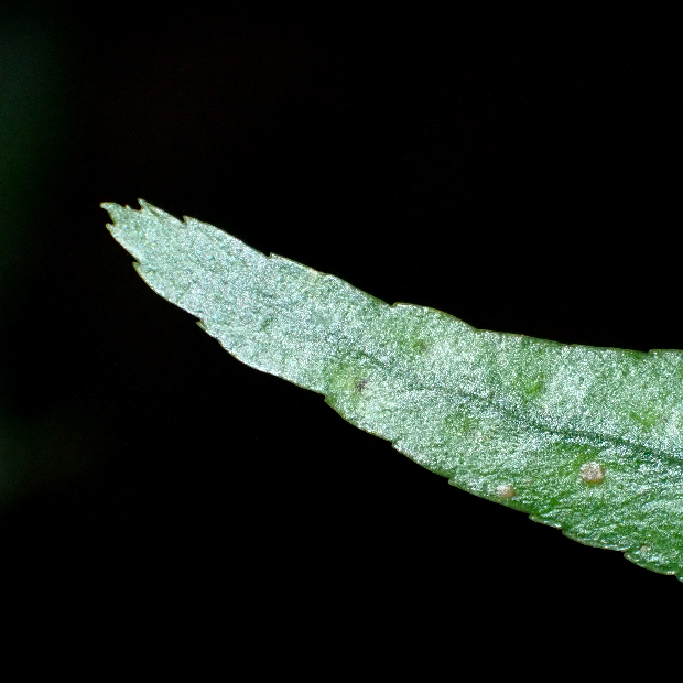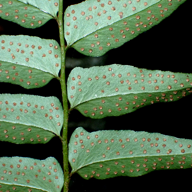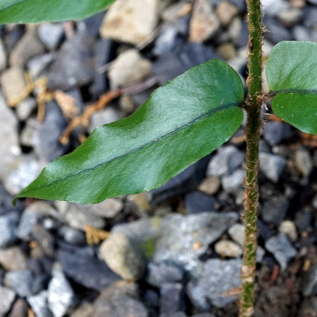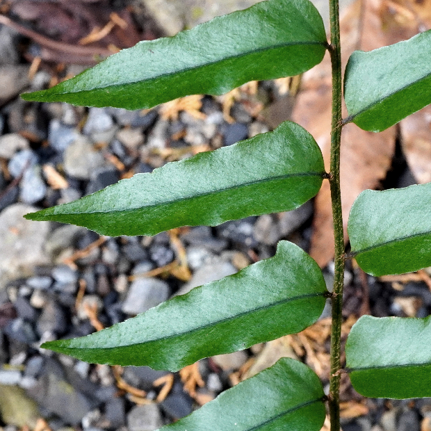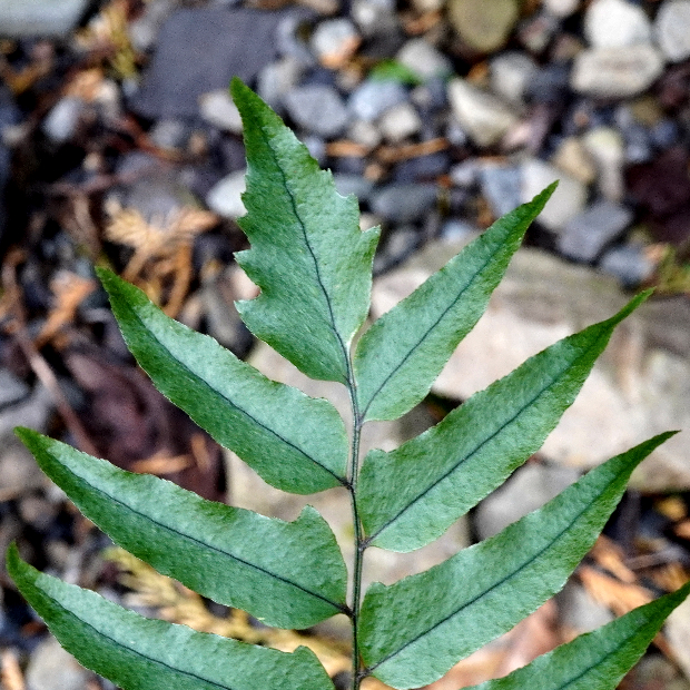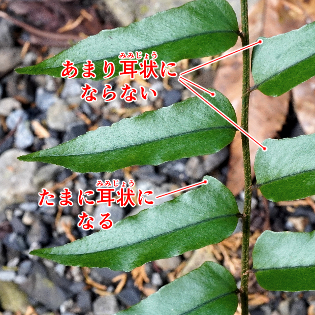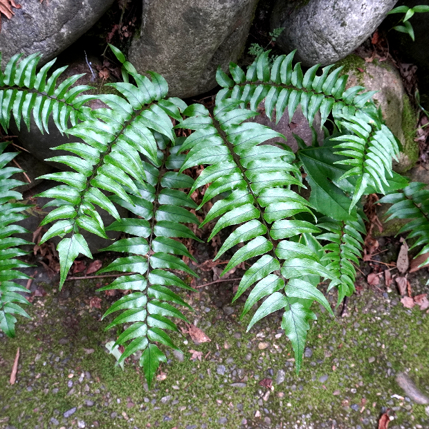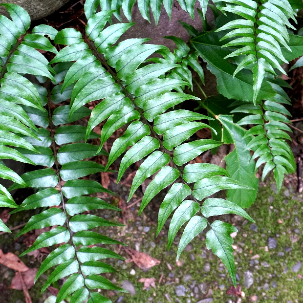 人里近くでよく見られるソテツのように葉を広げるシダ。 照り葉の通り、 表面はふつうツヤが強めです。 近縁のヤブソテツとは、 葉がやわらかく、 より暗い緑色をしていることなどで区別できます。