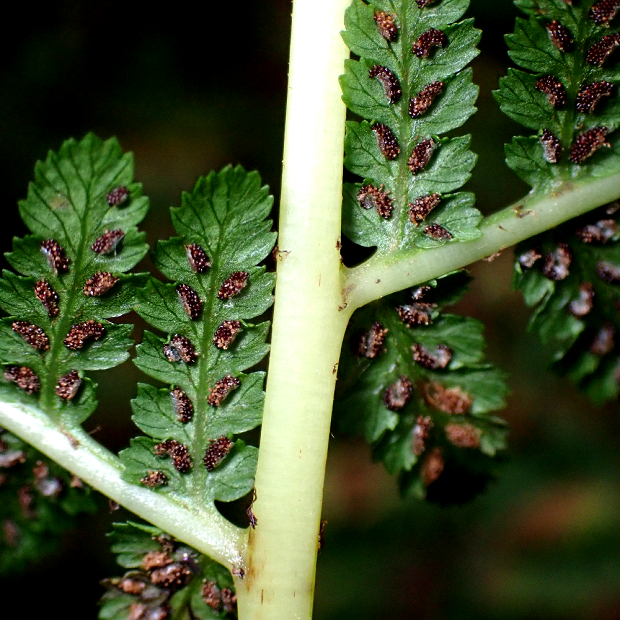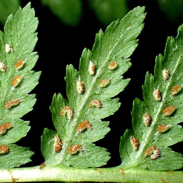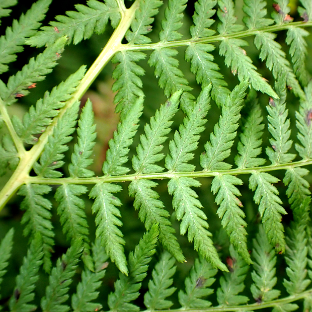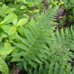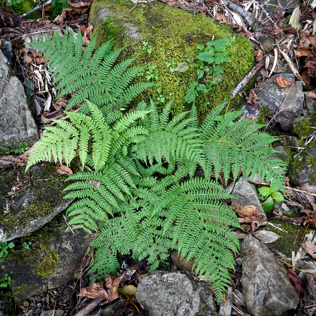 標高が高い場所によく見られる大きめのシダです。 葉柄につく鱗片が黒くねじれることが大きな特徴です。 名前は深山(みやま : 奥深い山のこと)に生えるメシダ科であることに由来します。