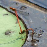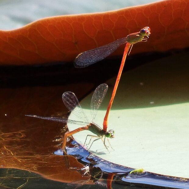 平地~丘陵地の水生植物が茂る池や沼で見られる中型のイトトンボ。 オスは全身が赤く斑紋はなく、 メスは橙褐色です。 生息地は局地的で環境省の絶滅危惧種に指定されています。