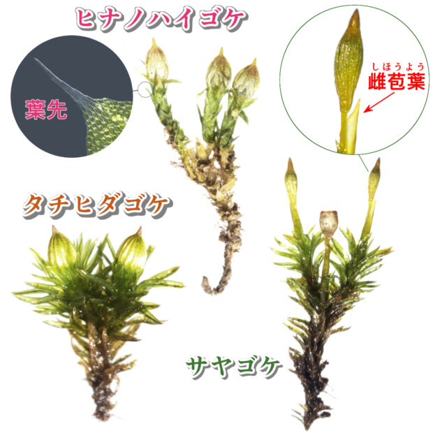・サヤゴケは蒴柄が長く、 サヤ状の雌苞葉(しほうよう)がそれを包む。 葉先は透明にならない。
