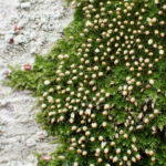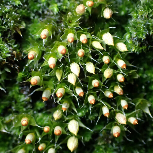 身近にありふれたコケの1つ。 しばしば街路樹のケヤキやサクラの幹を覆って白っぽい蒴(さく)をたくさんつけます。 蒴の帽が外れると中央が赤っぽく見え、 その姿から「クチベニゴケ」の別名もあります。