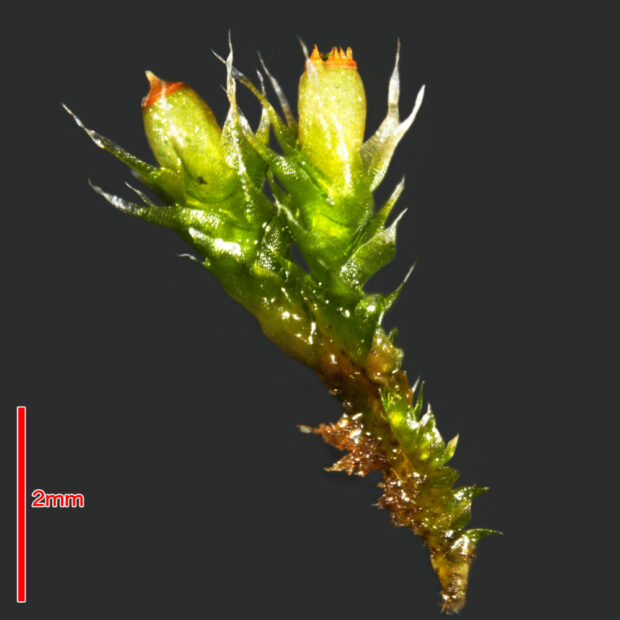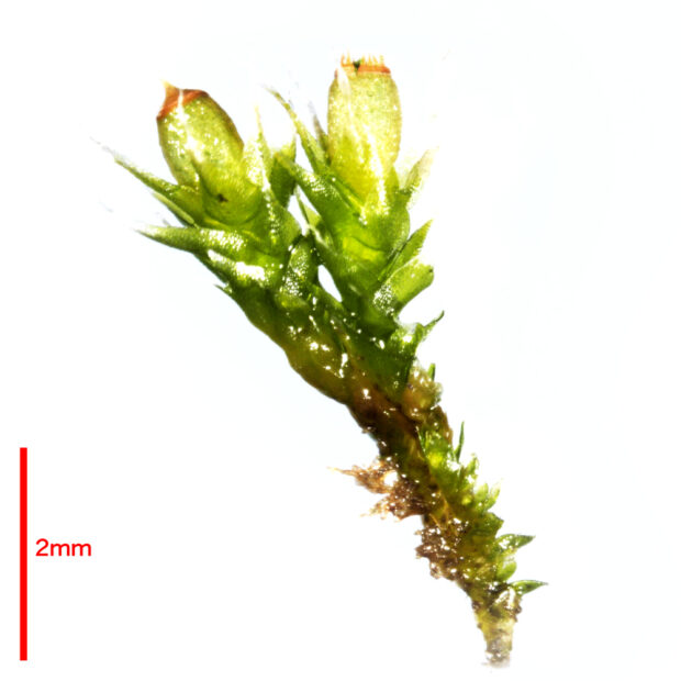 ・タチヒダゴケは蒴がより大きめで、 塊状になって生える。 葉先は透明にならない。