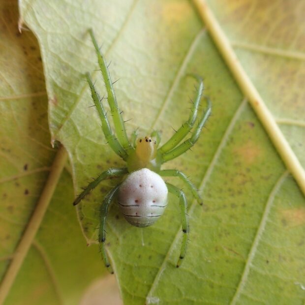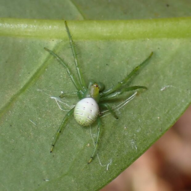 都市部から山地まで幅広く見られる黄緑色のクモ。 枝の間に円網の一部が切れるキレ網をはります。 糸は金色を帯びています。 クモは網にはおらず、 網の切れた部分の近くの葉に住みかを作り隠れています。