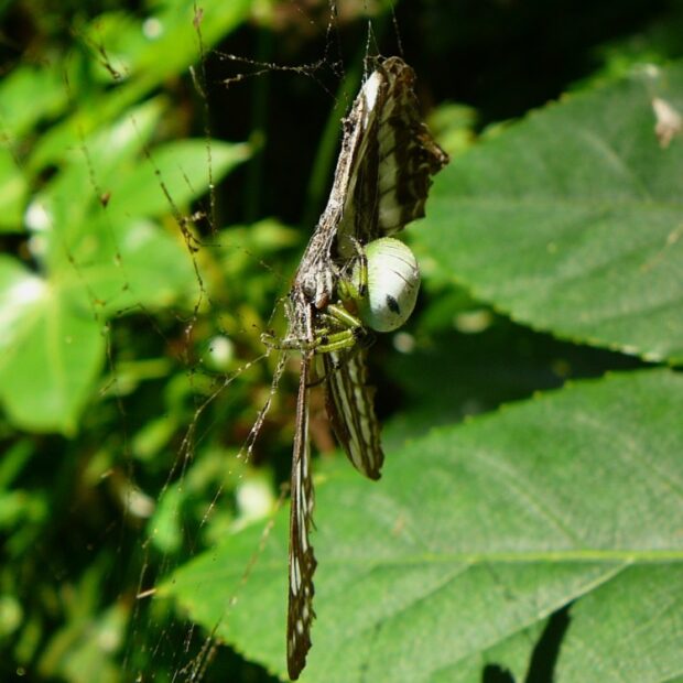 • 住みかの中でハチを食べている。 網の中心から住みかに糸が伸びており、 その振動を頼りに獲物を捕える。