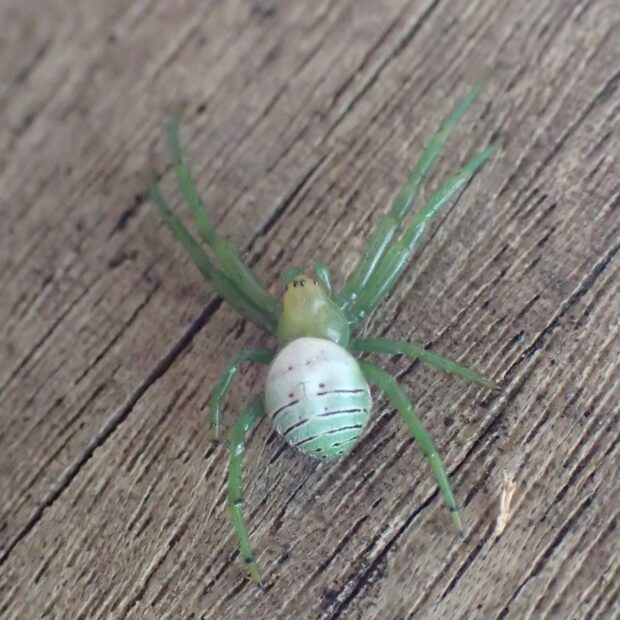 アオオニグモは、 春に成体になります。 腹部に1対の緑色の斑紋と階段状の横線があります。