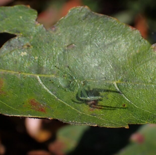• 幼体。 葉の上に糸で幕をはった住みか。 体の腹面(裏面)の緑色を見せているので目立たない。