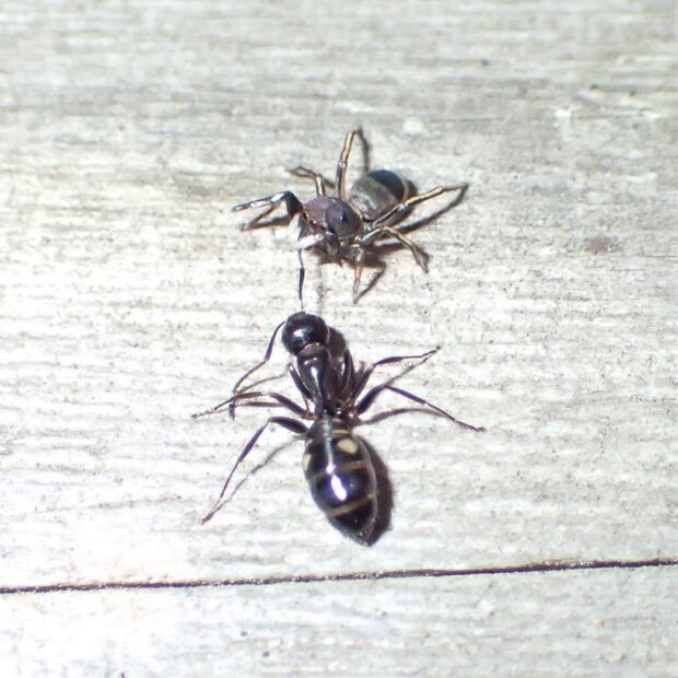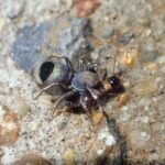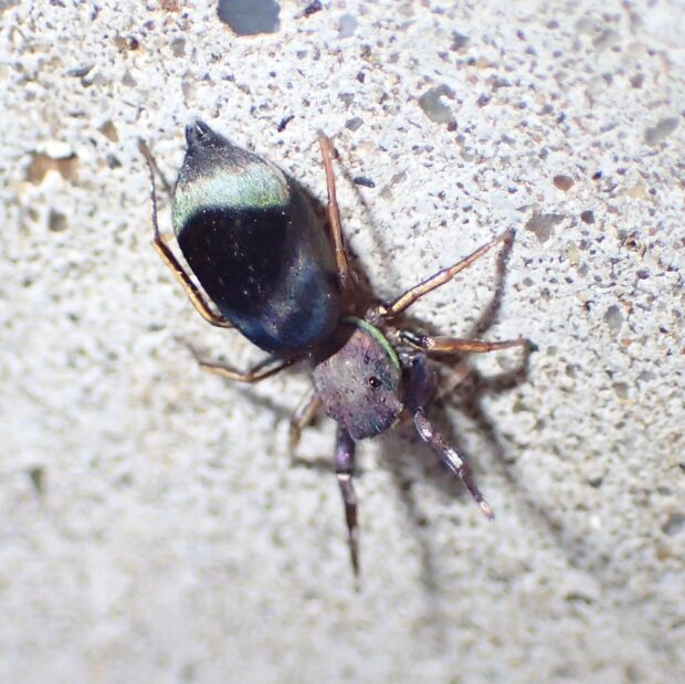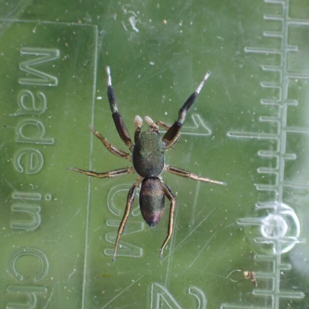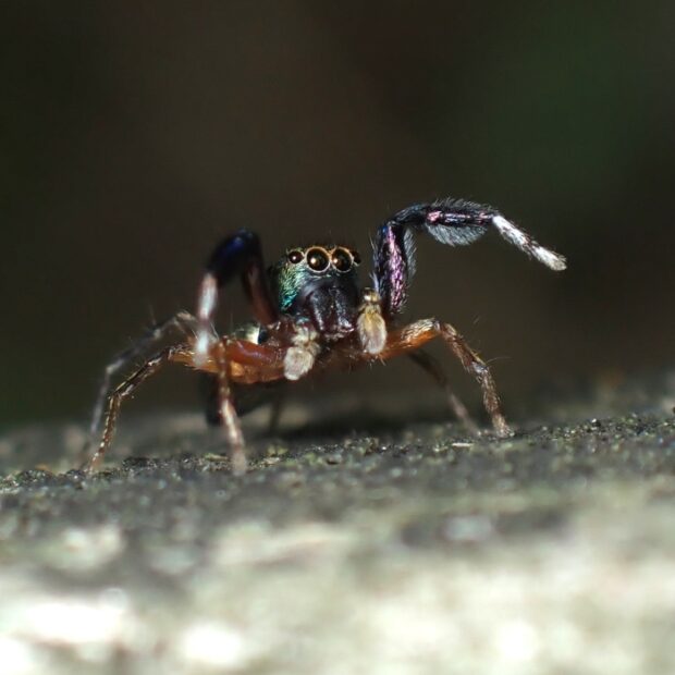 前のあし(第1脚)を高く振り上げて歩く美しいハエトリグモ。 主にアリを捕えますが、 それ以外のものも襲います。 平地~里山に多く、 公園や庭でも見られます。