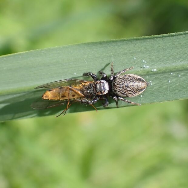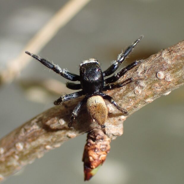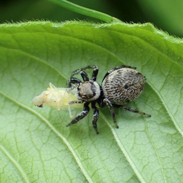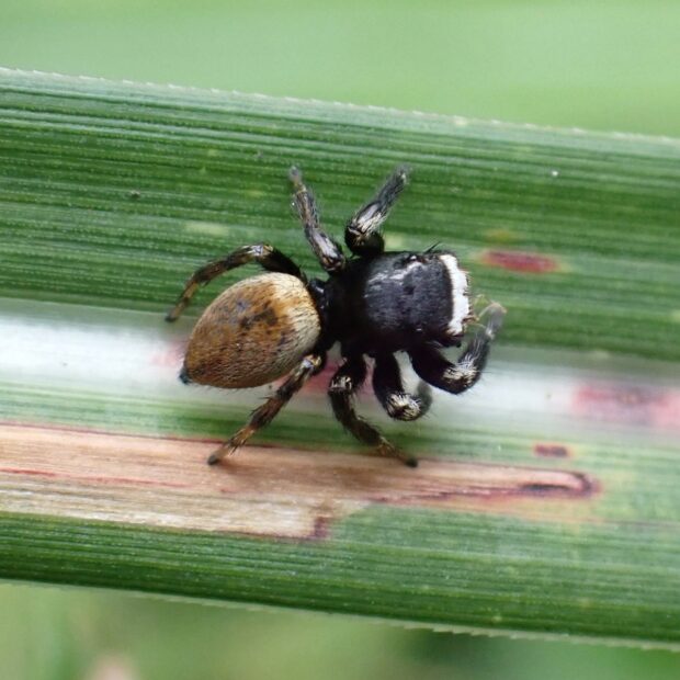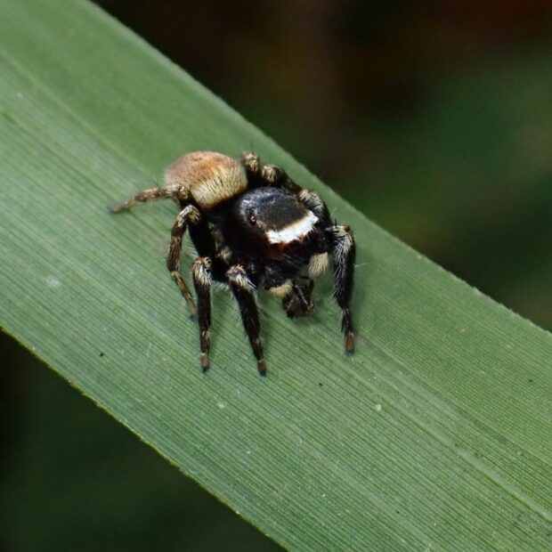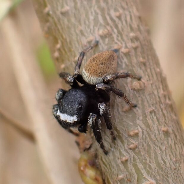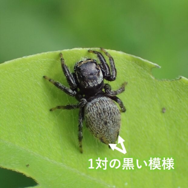 オスとメスで色や模様が全く違うハエトリグモ。 平地~山地に広く生息し、 市街地の公園や庭でも普通に見られます。 オスの頭胸部の前の白いラインが「まゆ毛」に見えることが名前の由来です。