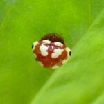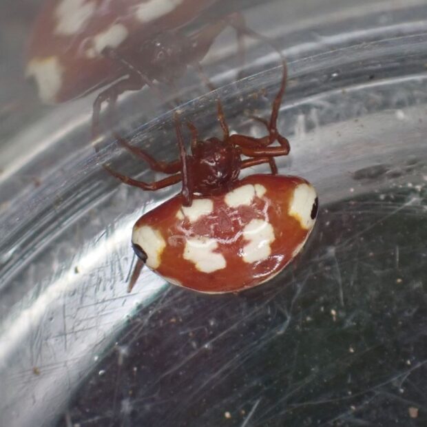 里山~山地に生息し、 昼間は草や木の葉裏でじっとしています。 夕方から活動を始め、 小さな同心円状のまるい網を張ります。 色の変異があり、 黒っぽいものや、 黒地に赤色が入るものがいます。