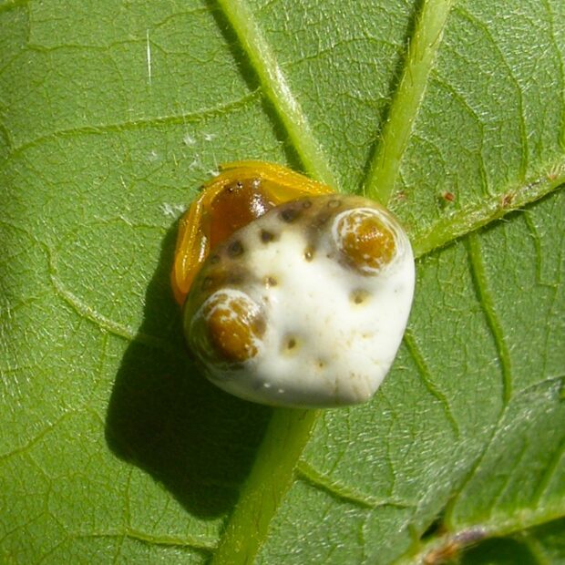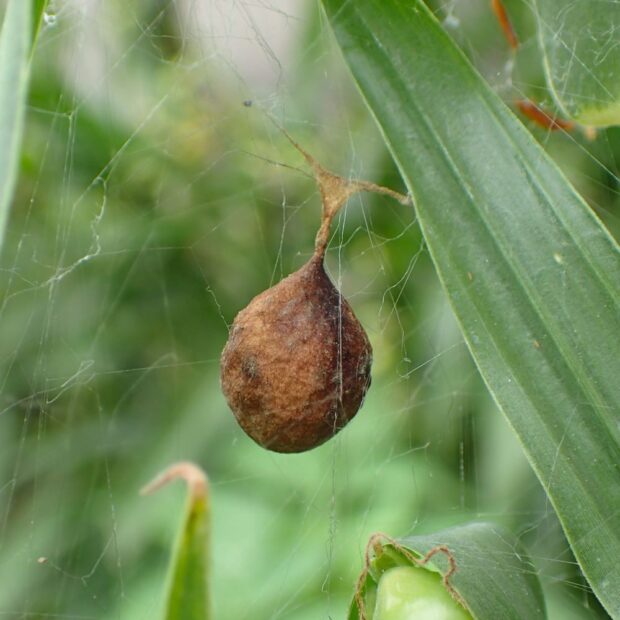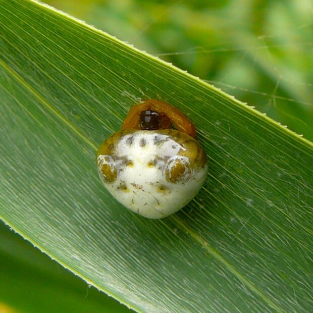 平地~山地に生息し、 昼間は草や木の葉裏でじっとしています。 夕方から活動を始め、 草や木の間に同心円状のまるい網を張ります。 横糸には粘球がついており、 ガがつかまると糸が切れ、 ガが宙づりになる仕組みになっています。
