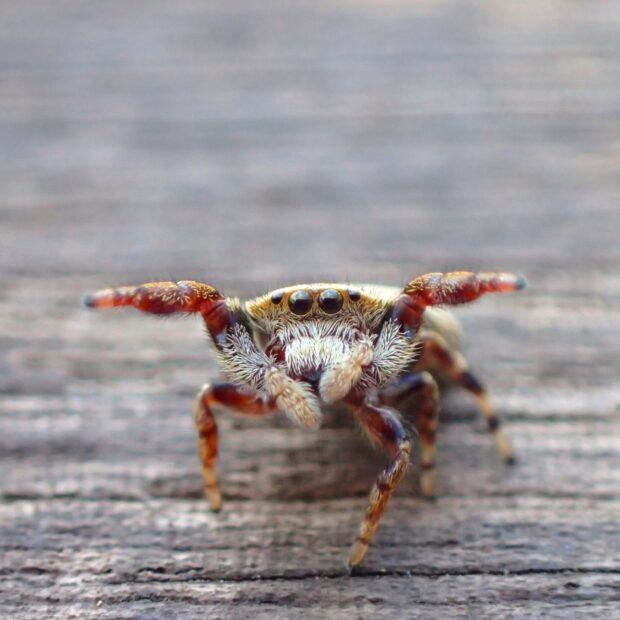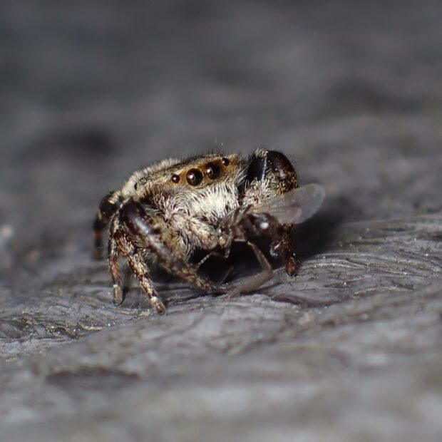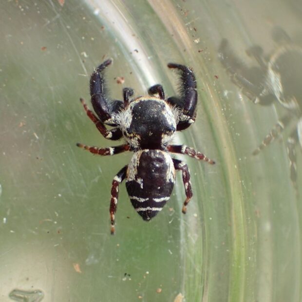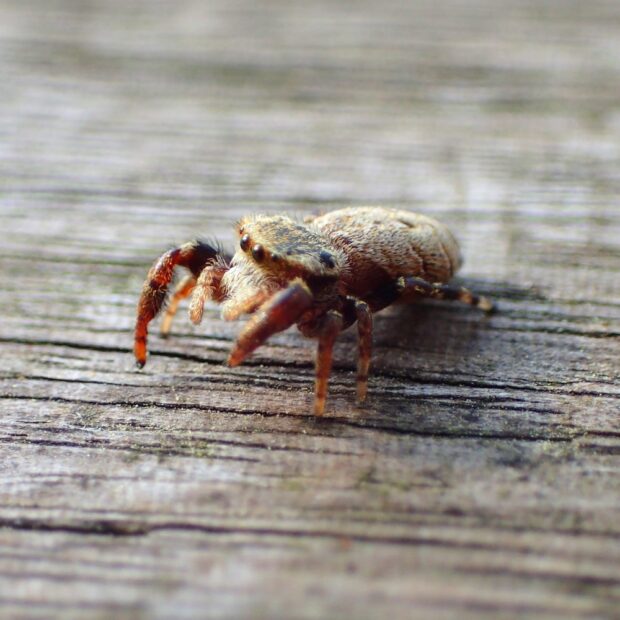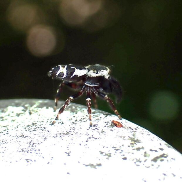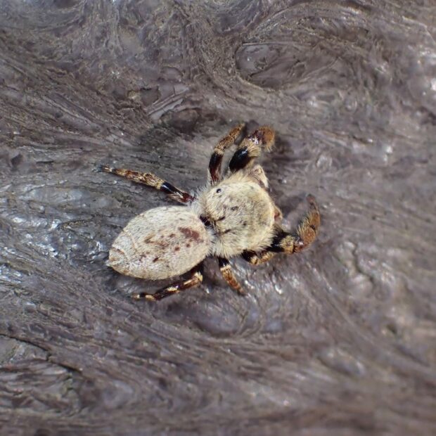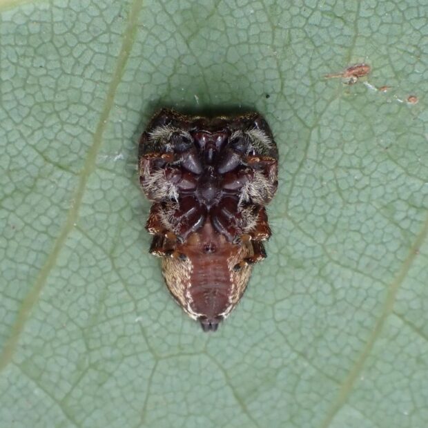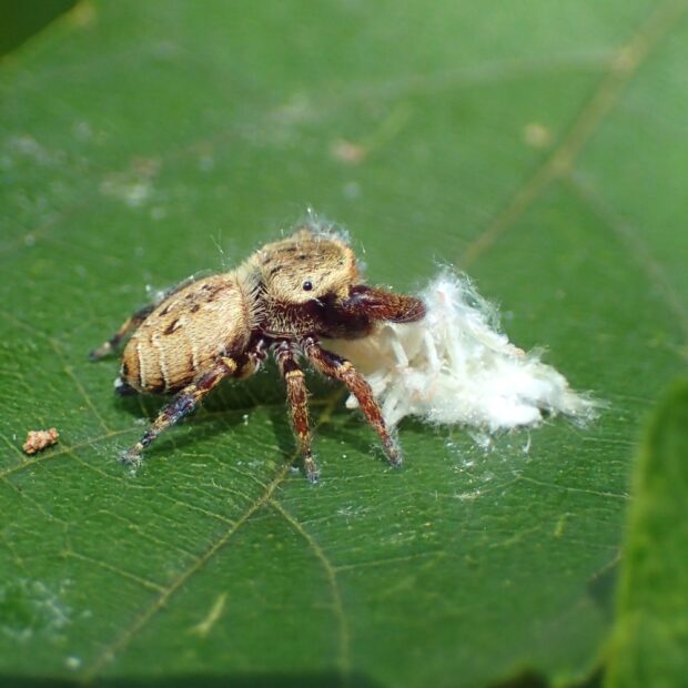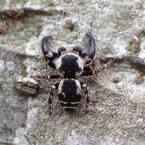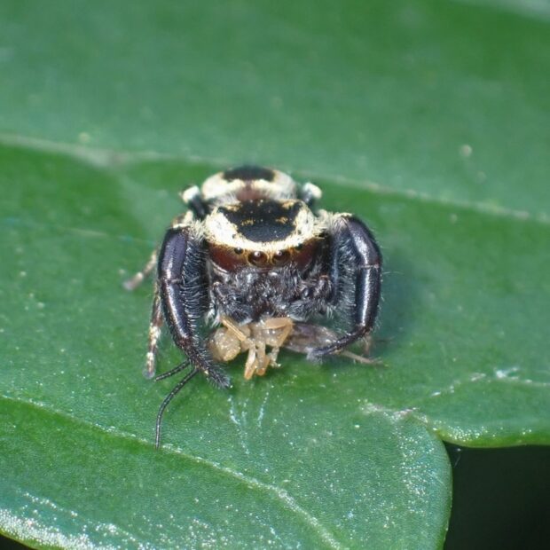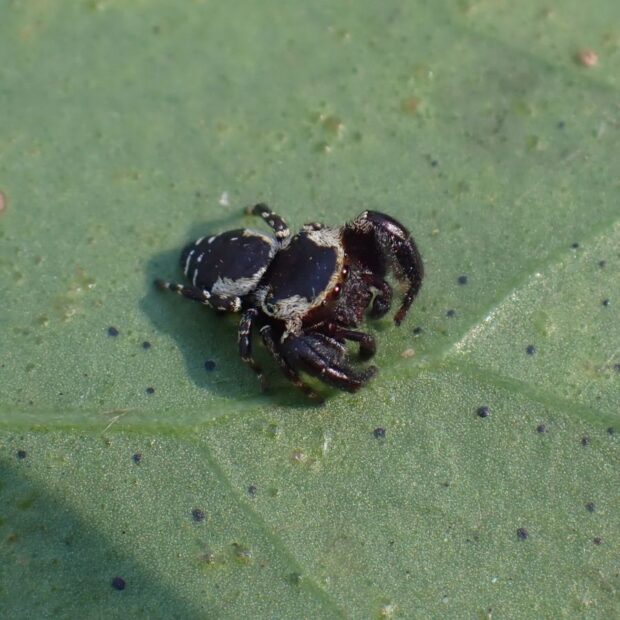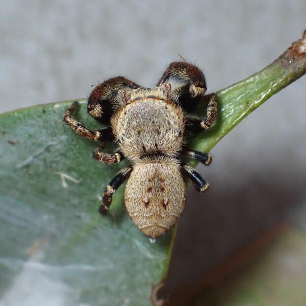 平地~山地まで広く生息しており、 草地や木の上で普通に見られるハエトリグモ。 頭胸部が幅広く平たいことが特徴。 オスとメスは色や模様が違っており、 メスは薄い茶色、 オスは黒っぽいです。