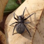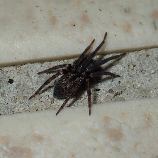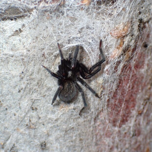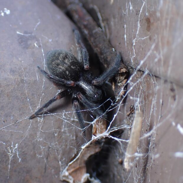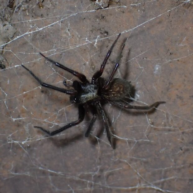 ウシオグモの仲間。 人工物のすき間にトンネル状の住みかを作り、 まわりにボロ網を張ります。 オーストラリア原産の外来種で、 分布を拡大しています。 昼間はトンネルの住みかでじっとしており、 夜になると網に出てきます。 外来種のハルカガケジグモに似ていますが、 本種は大型で色が濃いです。