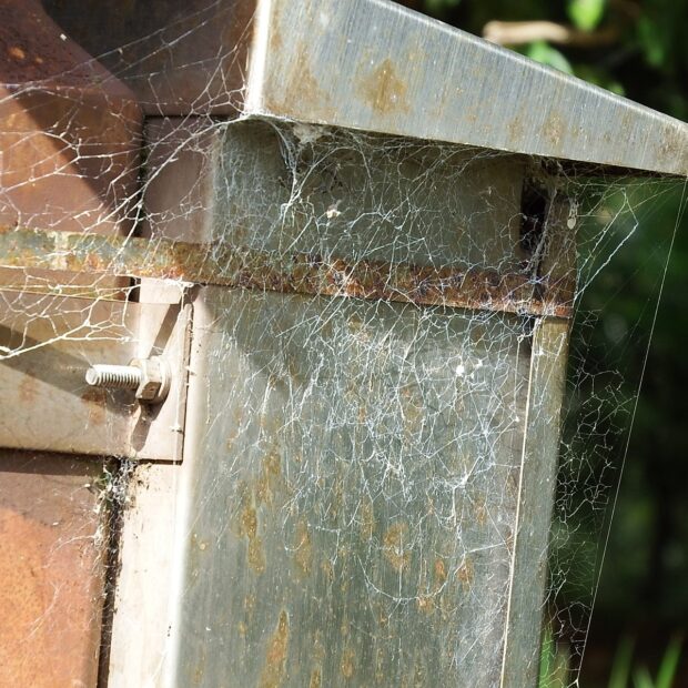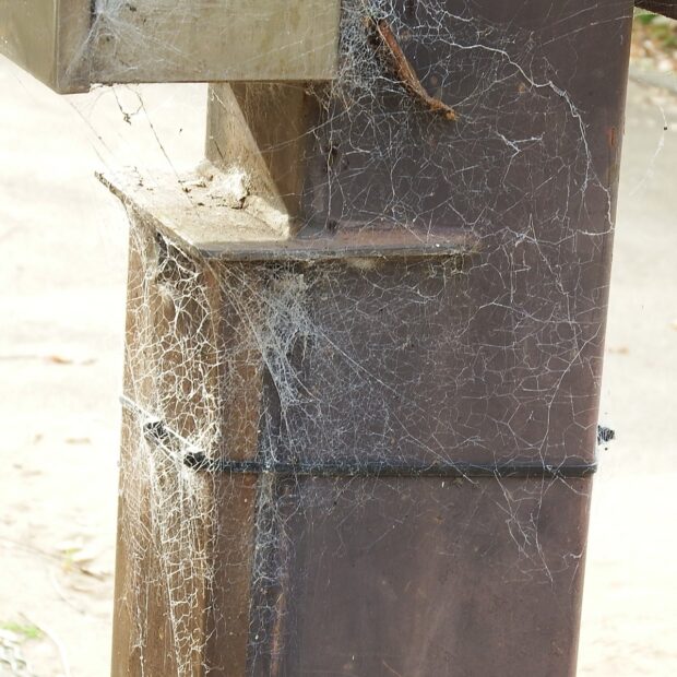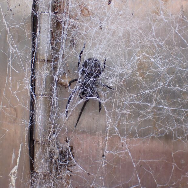 独特のボロボロの網を張る外来種のクモ