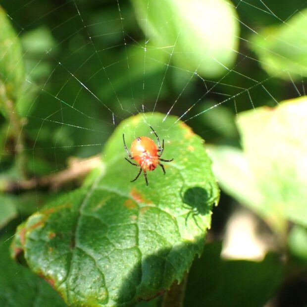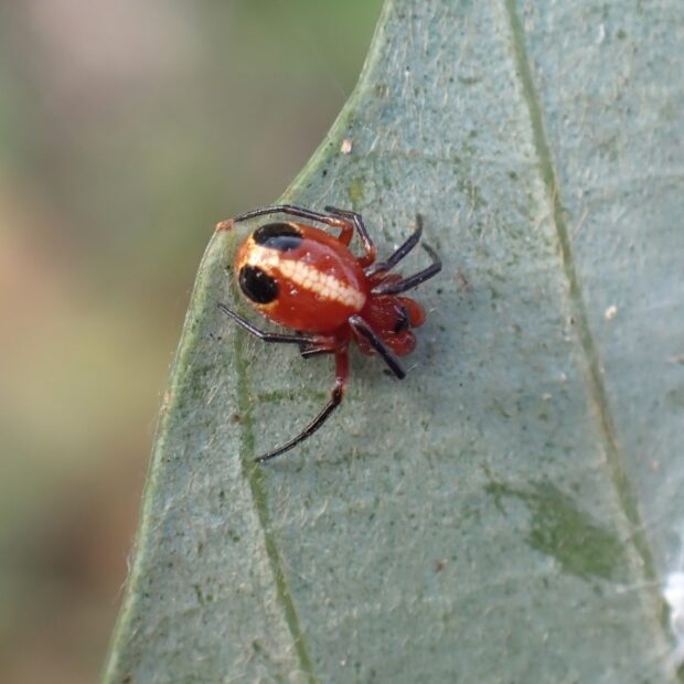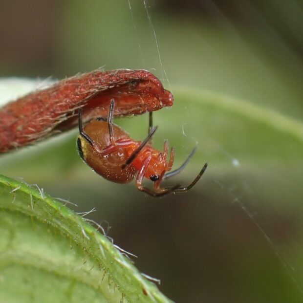 平地~山地で普通に見られるコガネグモの仲間。 猩々(しょうじょう=架空の動物)のように体が赤いことが名前の由来ですが、 腹部の斑紋や色には変異が多く、 黒いもの、 赤いもの、 黒色に白や黄色の線があるものなど、 様々なタイプが見られます。