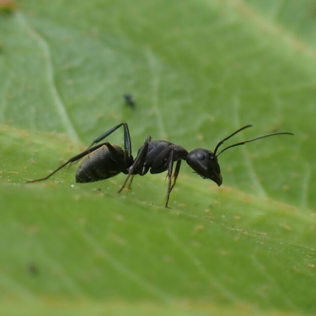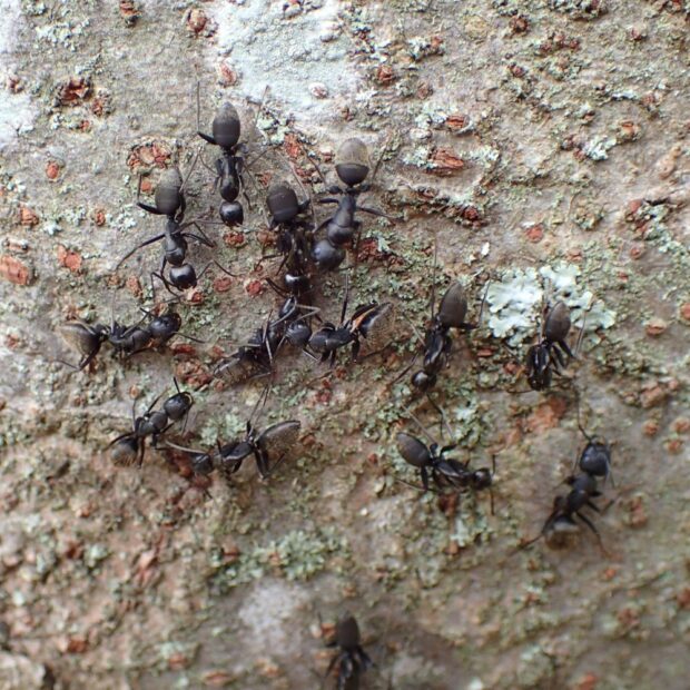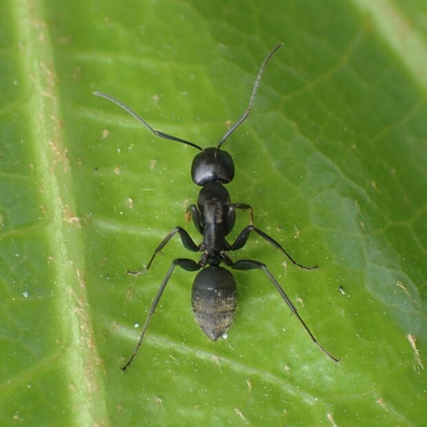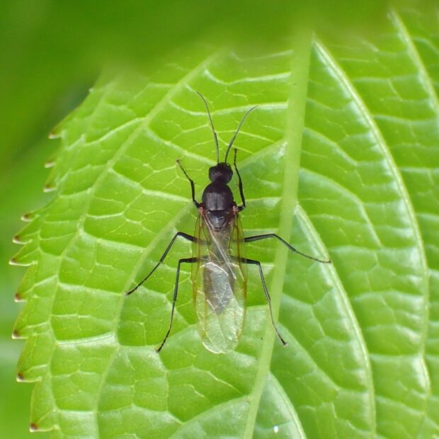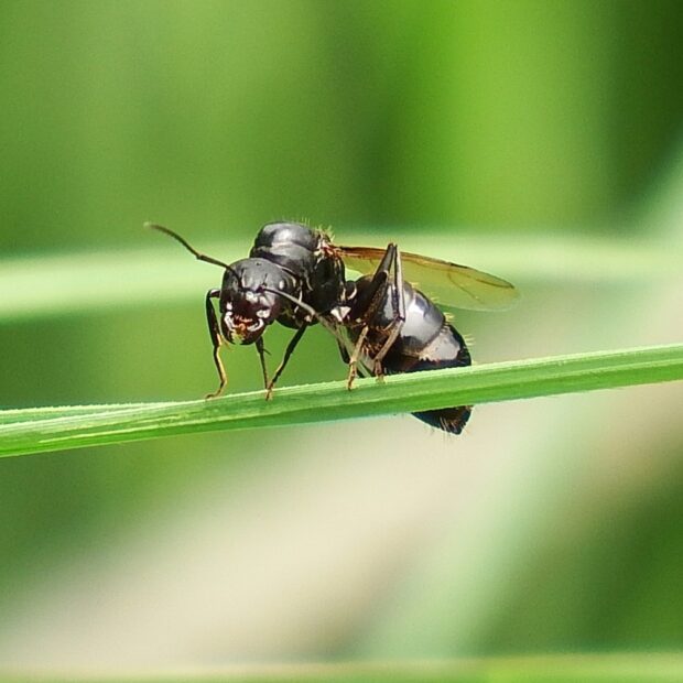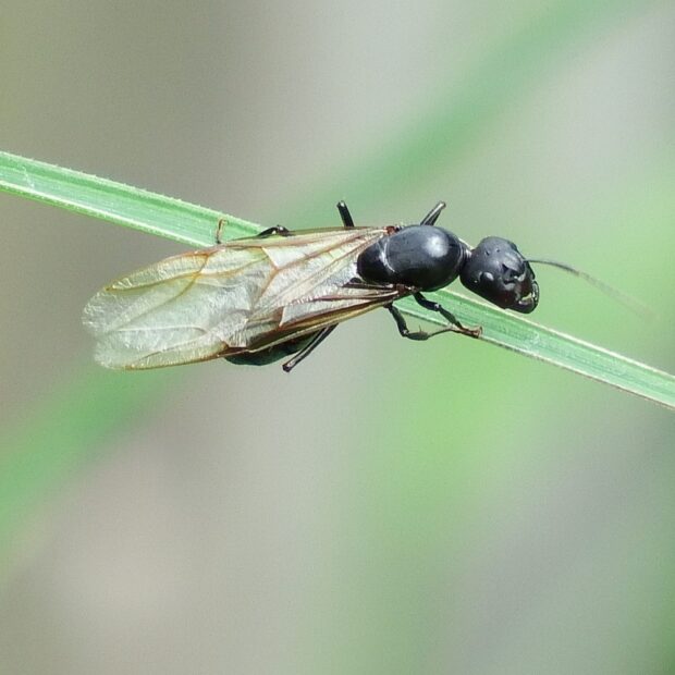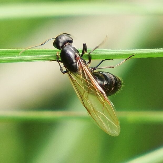 住宅地や公園などで普通に見られる黒い大きなアリ。 開けた地面に巣を作り、 入り口は土を盛り上げ噴火口のようになります。 5~6月の雨上がりの晴れた日の午後、 結婚飛行を行います。 (MT)