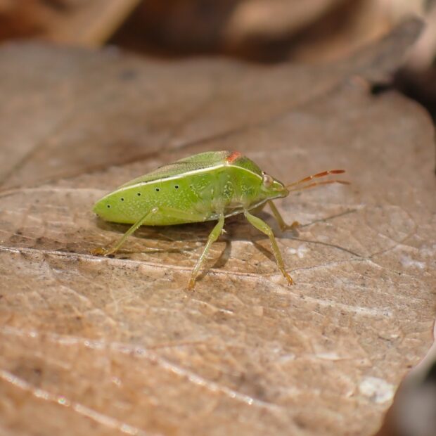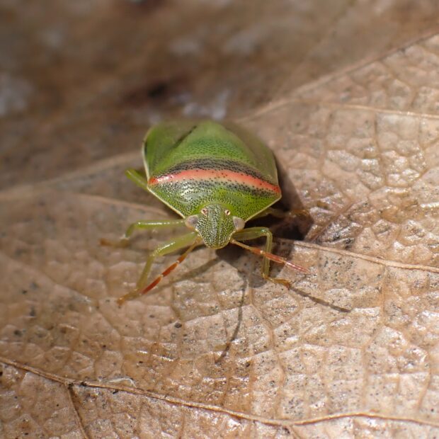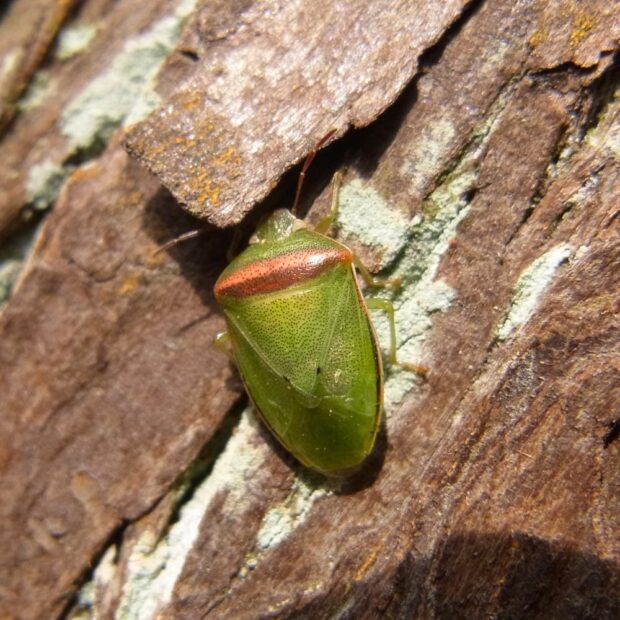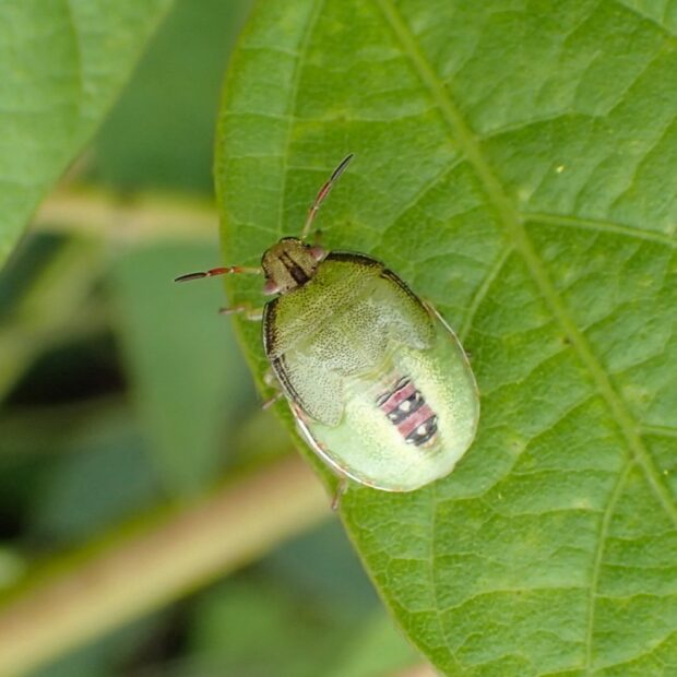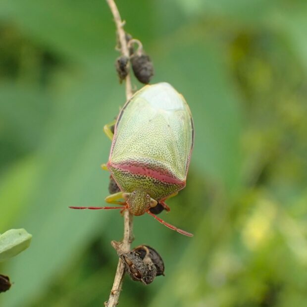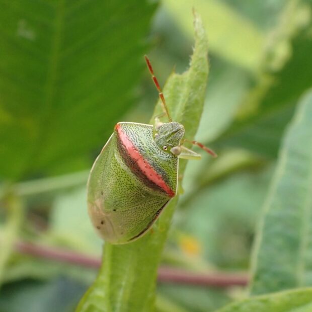体は透明感のある淡い緑色で、 胸に一文字の帯があるカメムシ。 帯が紅色なのがオスで、 白色なのがメスです。 マメ科植物に多く、 畑のダイズ、 アズキ、 インゲンなどのマメ類にもやって来ます。 (MT)