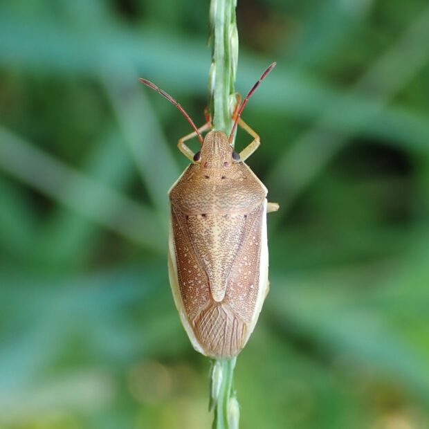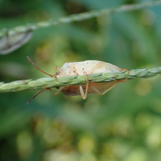 体の両側に白いヘリがあるイネ科植物で見られるカメムシ。 成虫は7月頃田んぼに現れ、 イネの穂を吸い、 斑点米になることがあります。