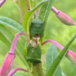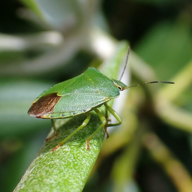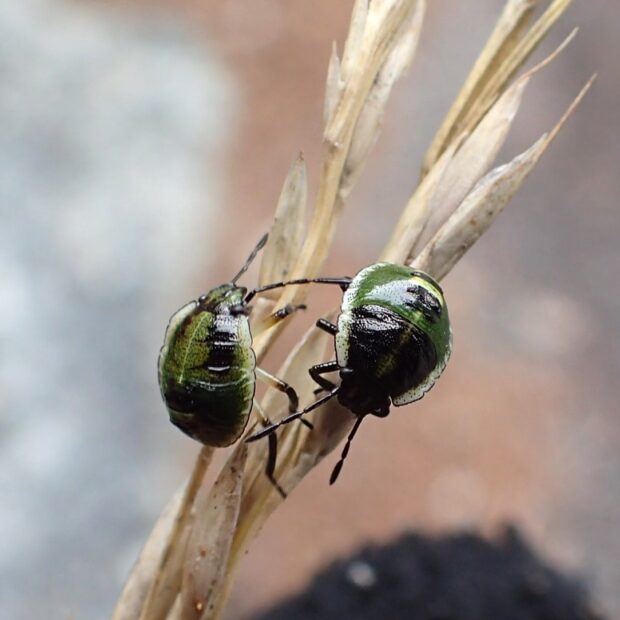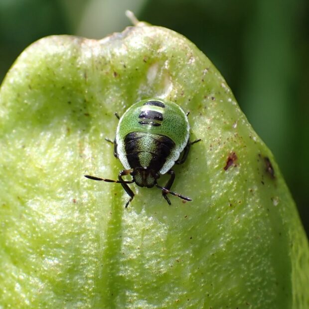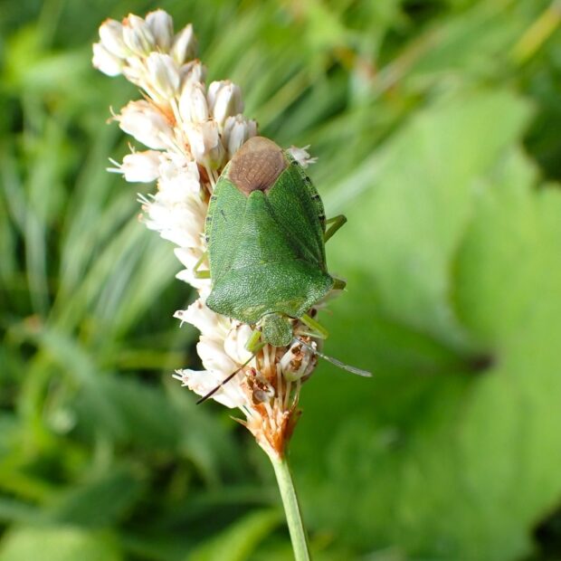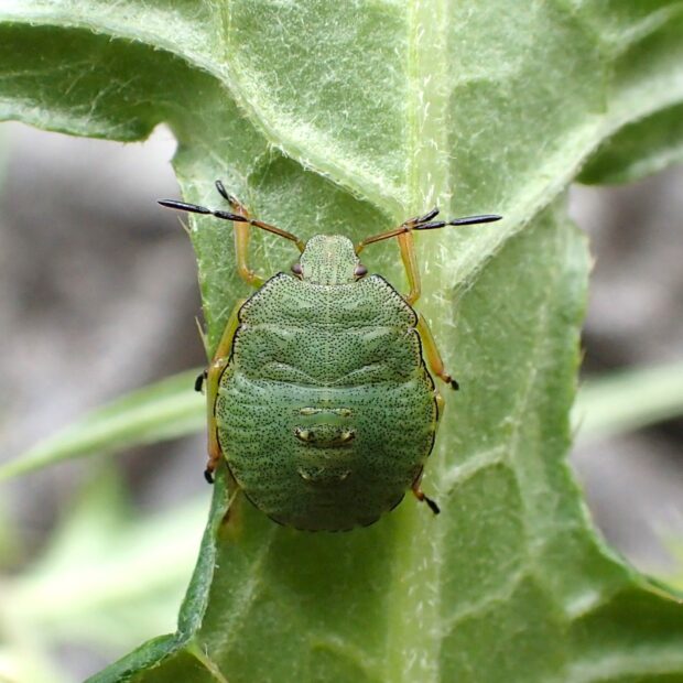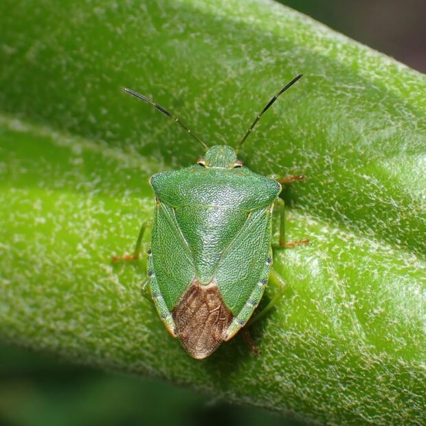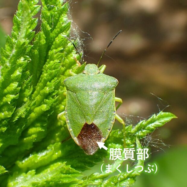 全身緑色で膜質部が褐色、 山地性のカメムシ。 山の草原などに普通に生息していますが、 北海道や東北地方では平地でも見られます。 秋が深まると褐色に変化します。