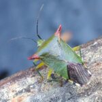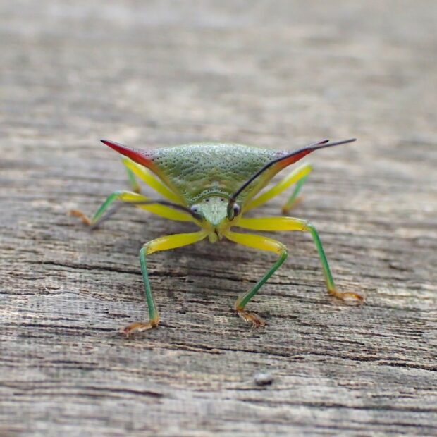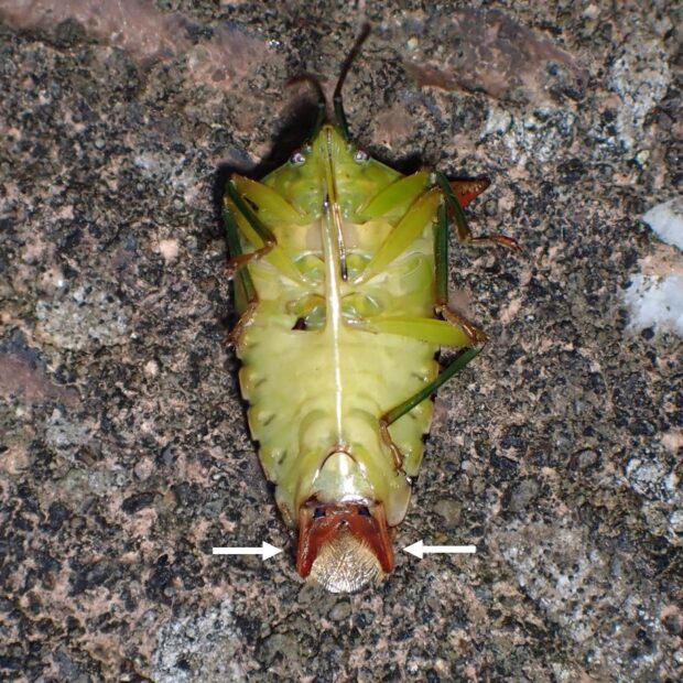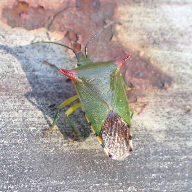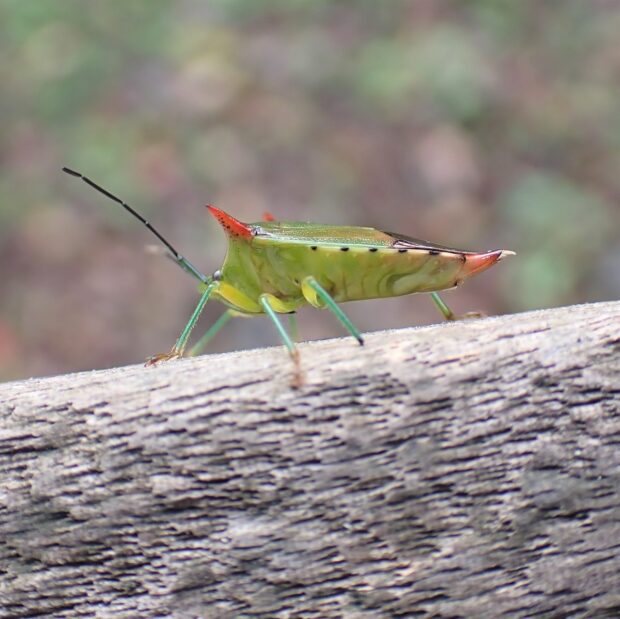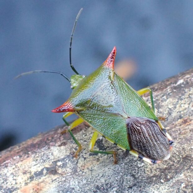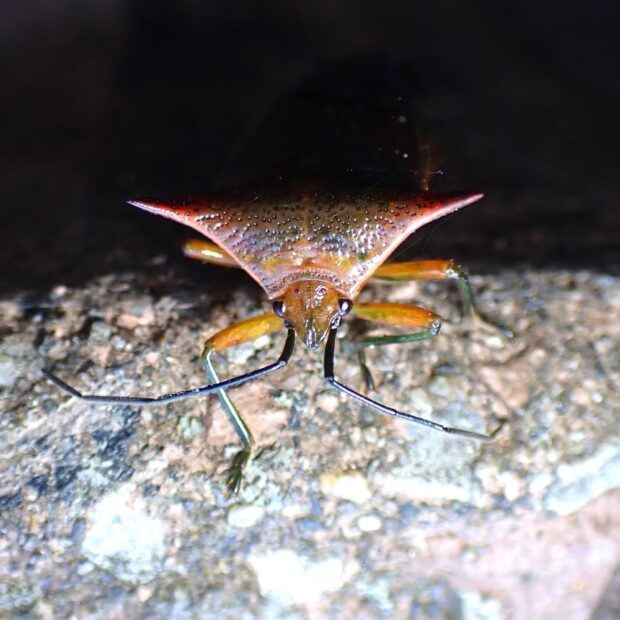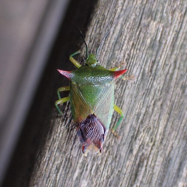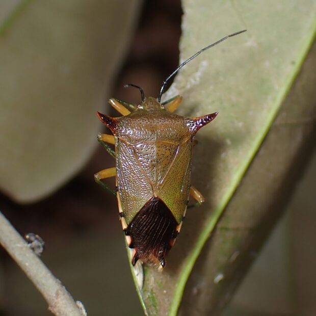 胸の両側の赤いツノが極めて鋭いツノカメムシ。 幼虫は主にケンポナシで育つことが知られています。 オスは、 腹部の末端に赤いハサミ状の突起がありますが、 メスにはありません。