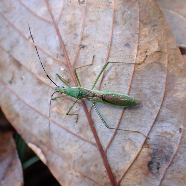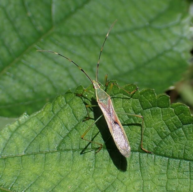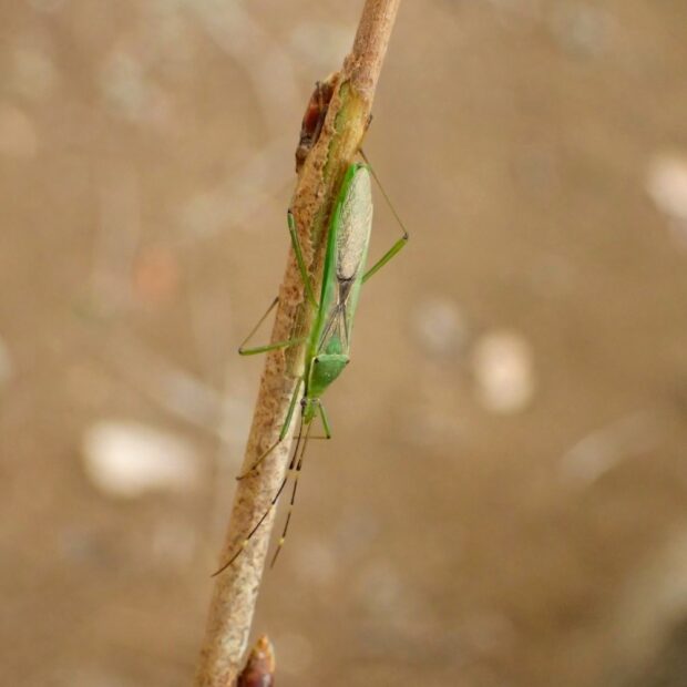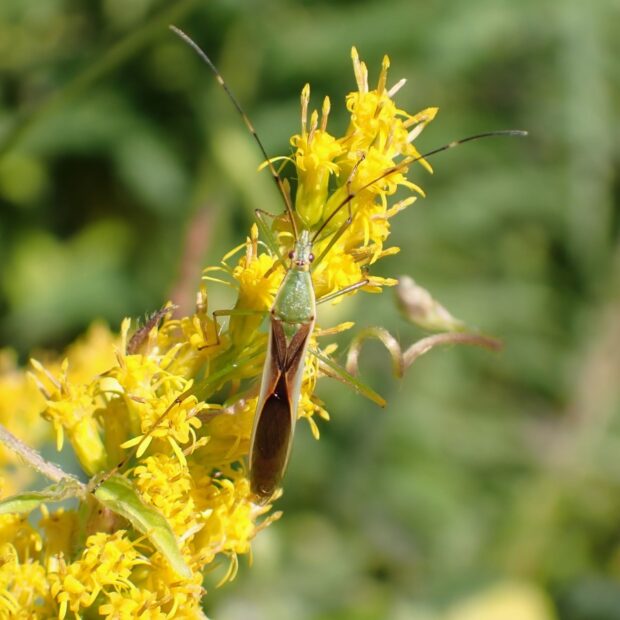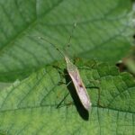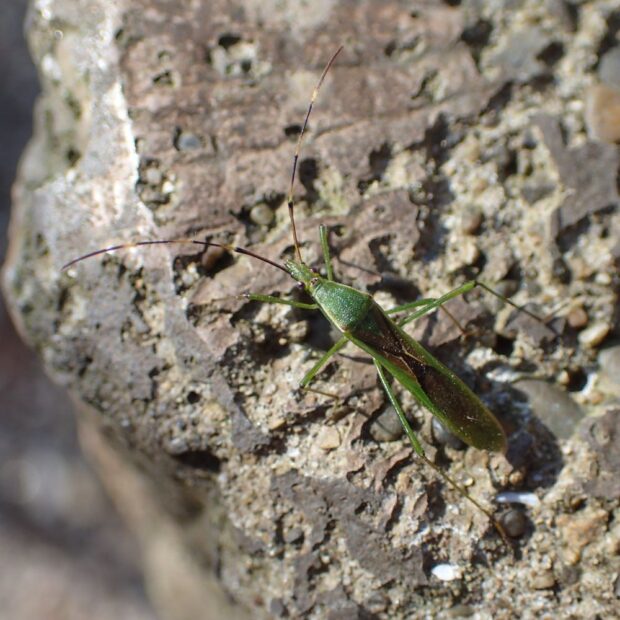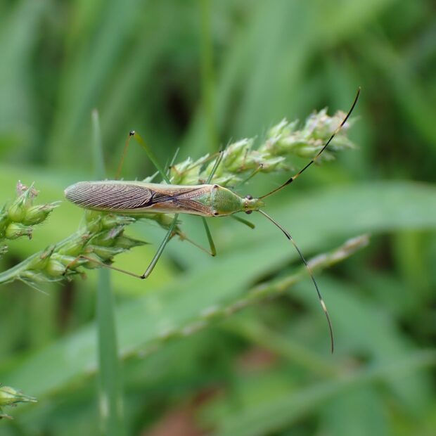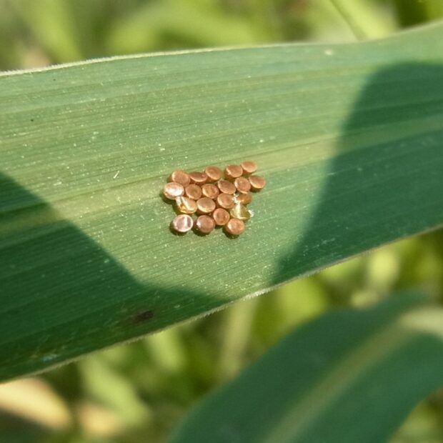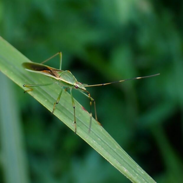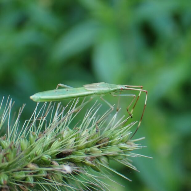 イネ科植物につく緑色のほっそりしたカメムシ。 イネ科の雑草が生えている草はらで多く見られ、 田んぼのイネの穂にもやって来ます。 カメムシがイネの穂を吸うと、 コメは斑点米になります。