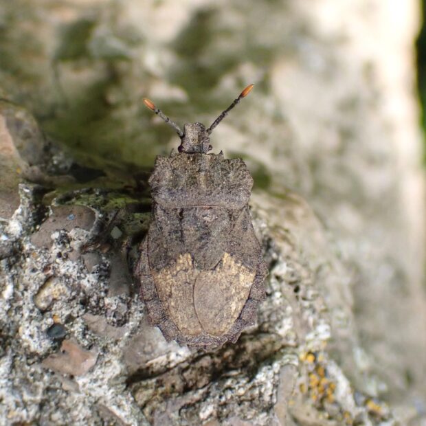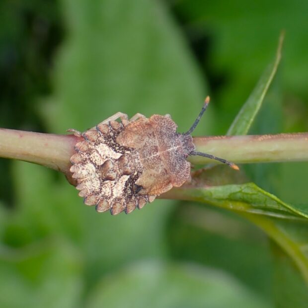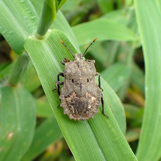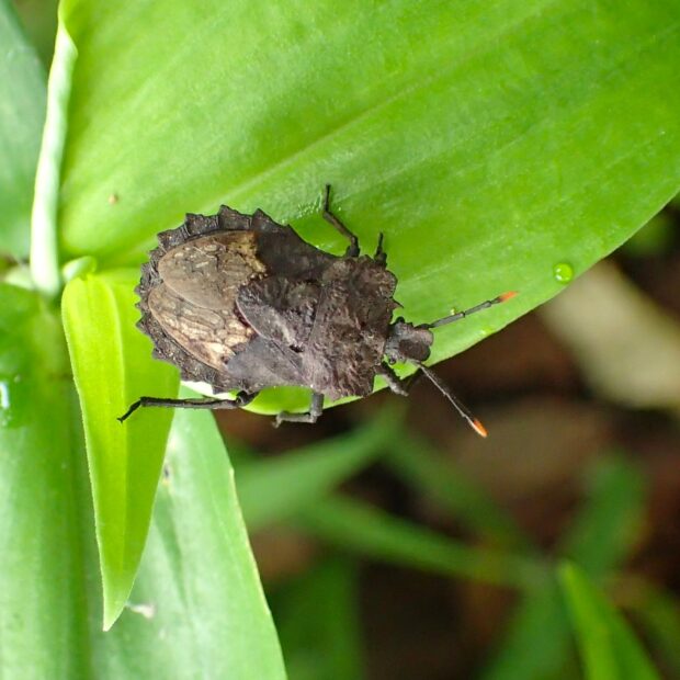 茶褐色で、 腹部の周りはノコギリのようにギザギザしたカメムシ。 ウリ科植物につき、 畑のカボチャやキュウリなどにもやって来ます。 鎧を着たような姿と先端がオレンジ色の触角が特徴です。