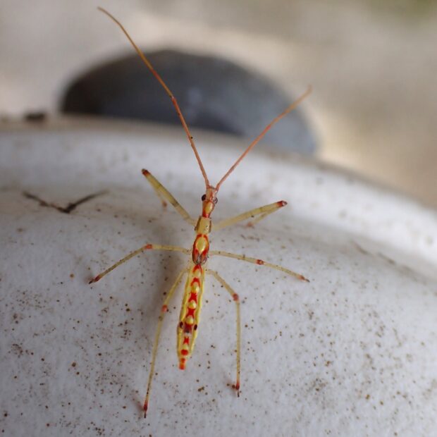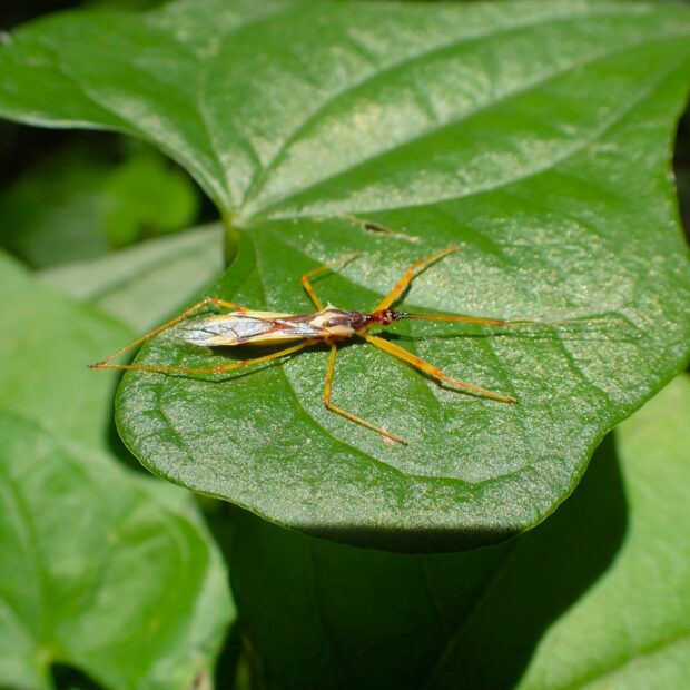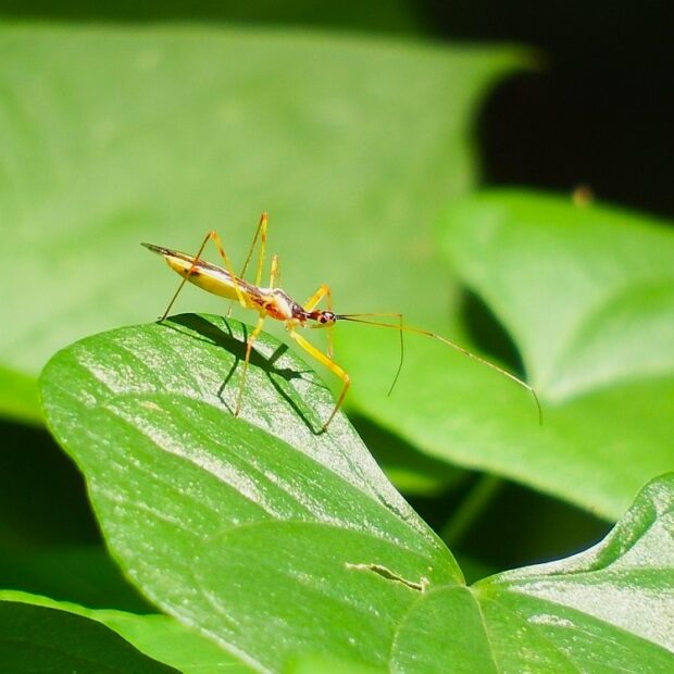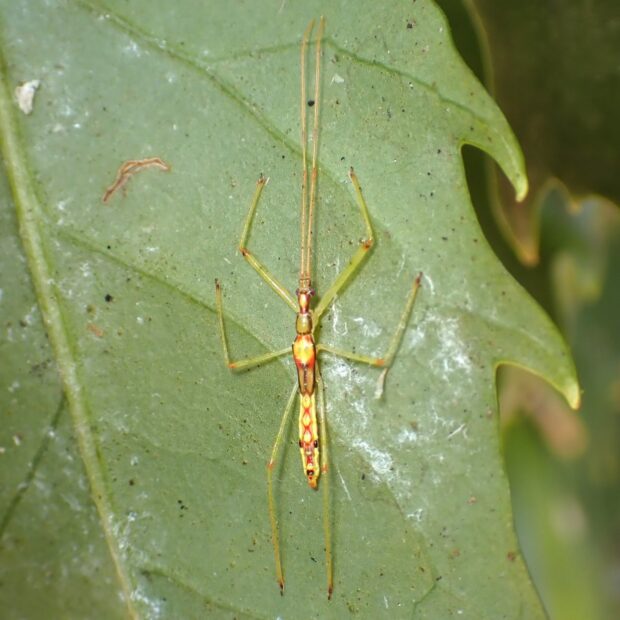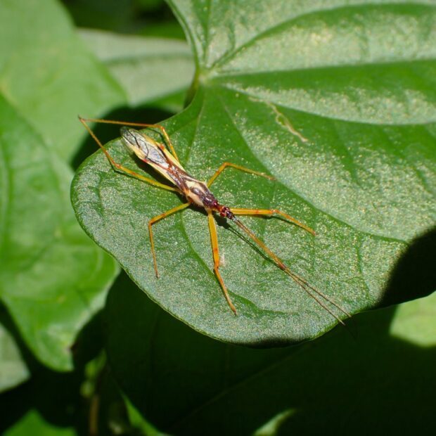 木の上で生活している、 数はやや少ない美しいサシガメ。 サシガメは他の昆虫などを捕えて体液を吸う、 肉食性のカメムシの仲間です。 幼虫で越冬し、 冬は木の葉裏や手すりなどで見られます。