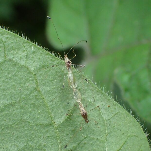 とても小さなイトカメムシの仲間。 キリ、 ゴマ、 ヒヨドリジョウゴなどで見られます。 触角とあしが長く、 ほっそりと繊細な姿をしています。 イトカメムシに似ていますが、 本種はより小型で、 触角とあしの紋が明瞭です。