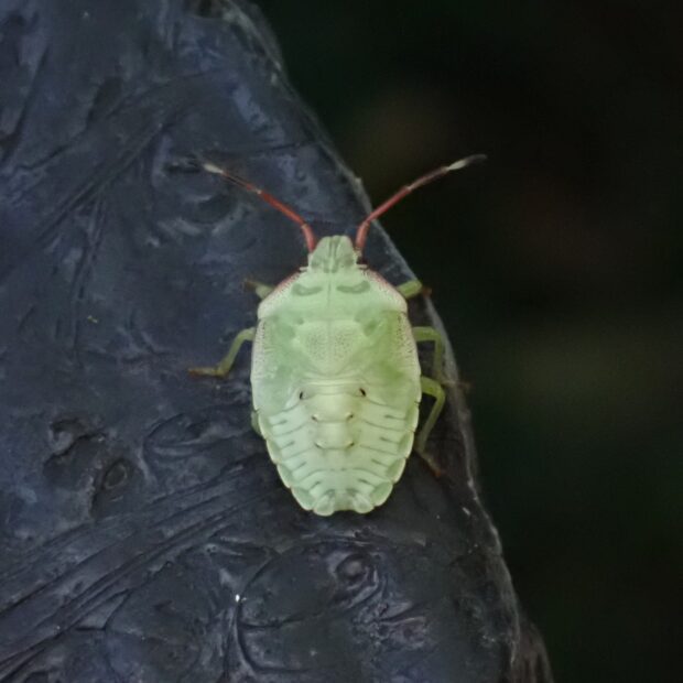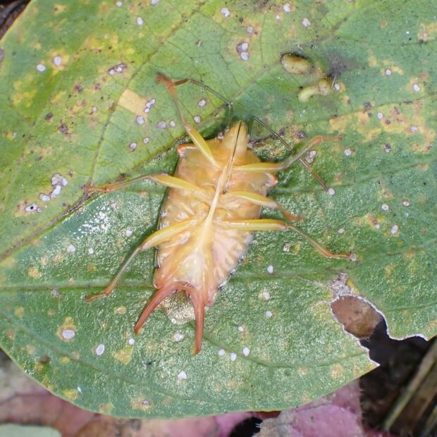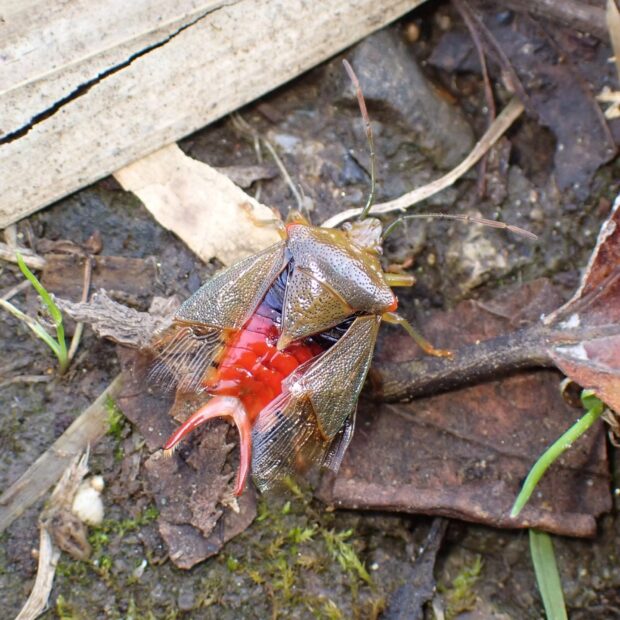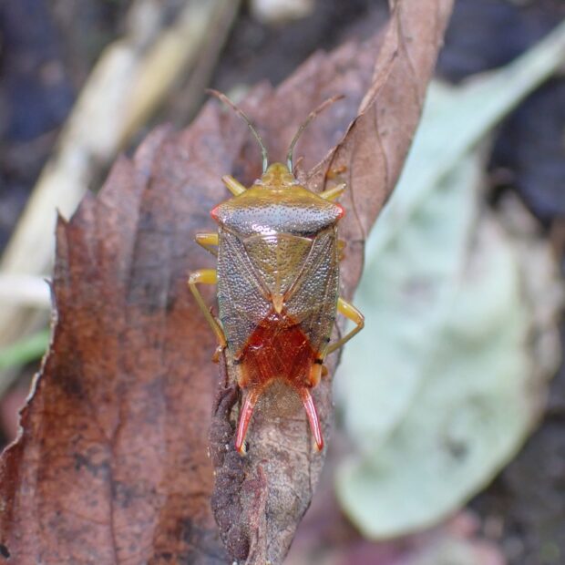 緑色のツノカメムシの仲間。 オスはお尻のところにハサミのような突起があり、 赤色で長く、 ハの状に張り出しています。 メスには突起がありません。 (MT)