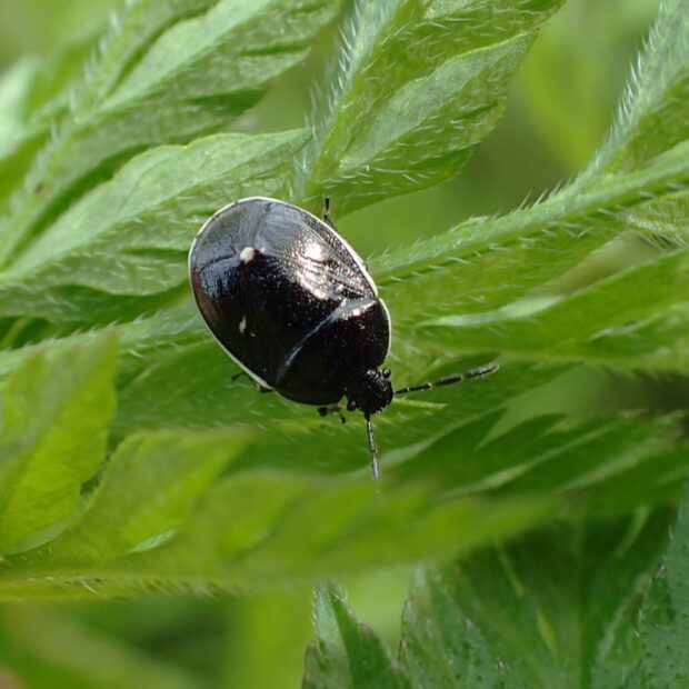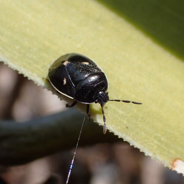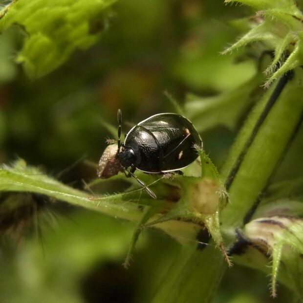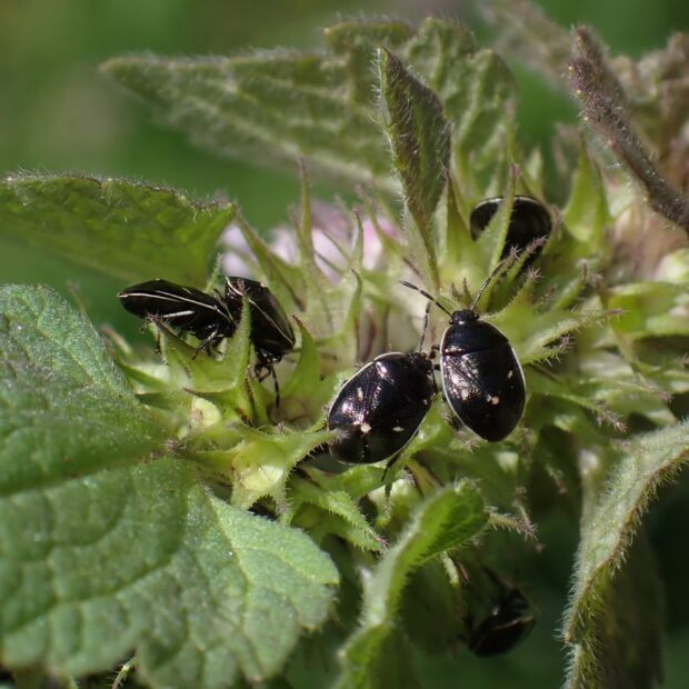 黒い体に白いふちどり、 背中に3つの白い紋があるカメムシ。 シソ科の草に集まります。 お母さんカメムシは産卵後、 卵を守り、 幼虫がふ化した後も、 幼虫にエサのタネを運びます。