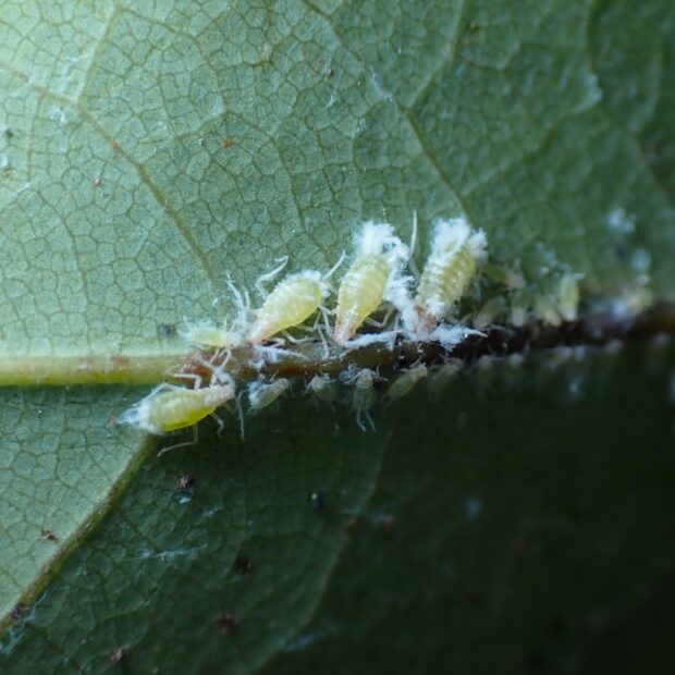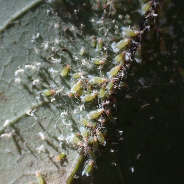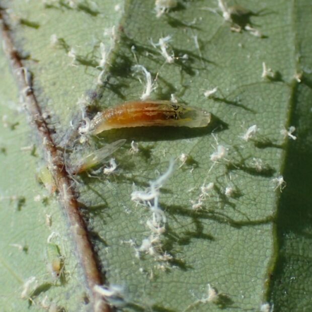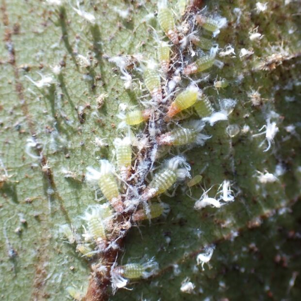 タブノキの葉裏で生活する綿だらけのアブラムシ。 体の色はオレンジ色と淡い黄色のツートンカラーできれいです。 白い綿のようなロウ物質で覆われます。 (MT)