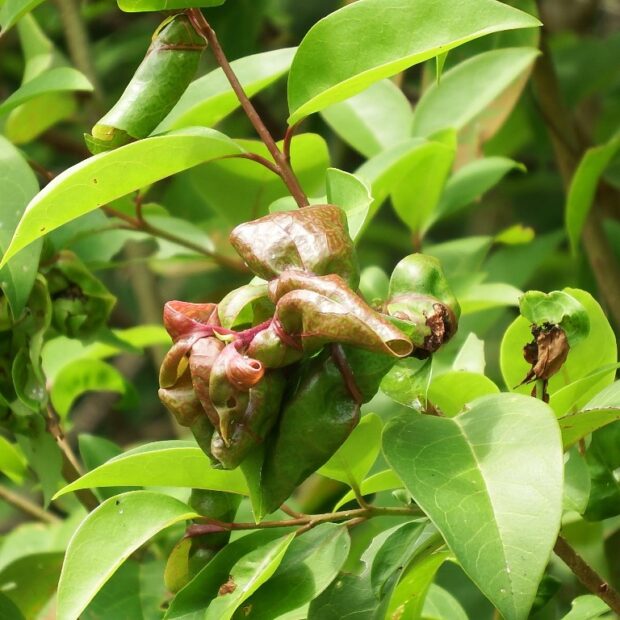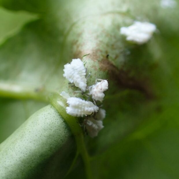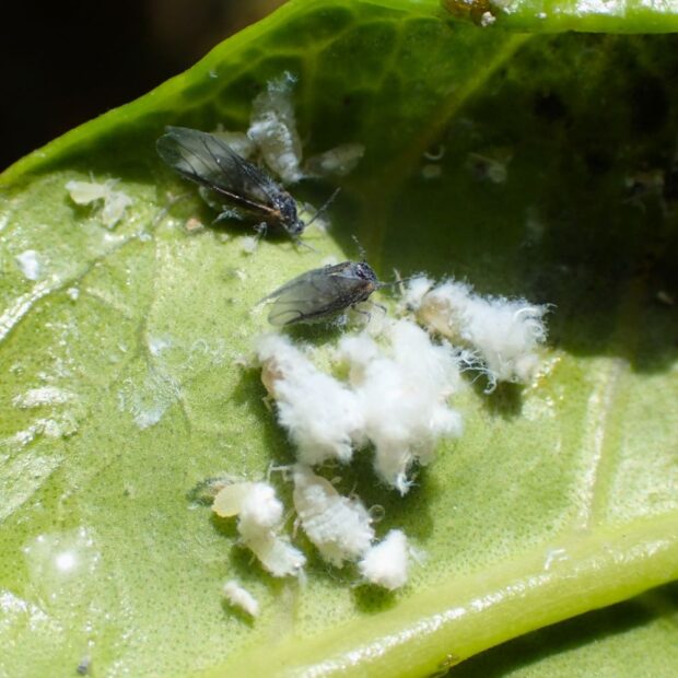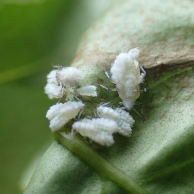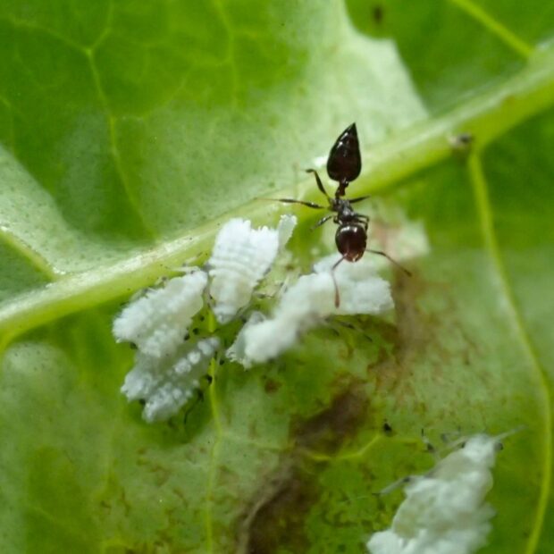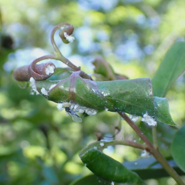 綿のようなロウ物質に覆われたアブラムシ。 トウネズミモチやネズミモチの葉を内側に巻き、 その中で生活しています。 アブラムシのお尻から出す甘露(かんろ)を求めてアリがやって来ます。