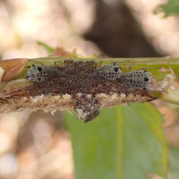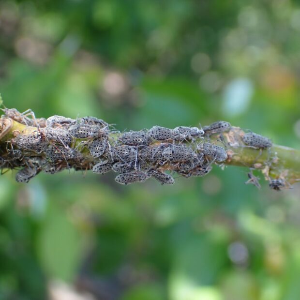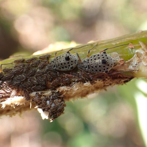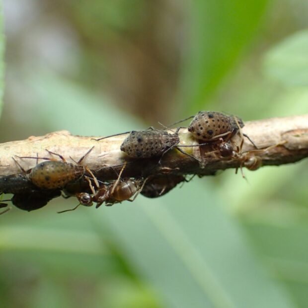 ヤナギの幹や枝につく黒いコブのある大きなアブラムシ。 腹部中央の黒い大きなトゲのような突起と両脇の小さな突起が特徴。 (MT)