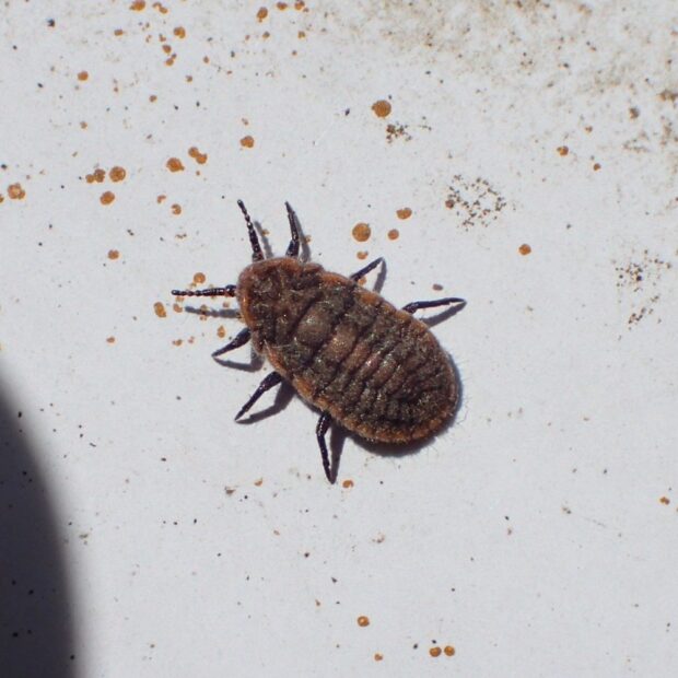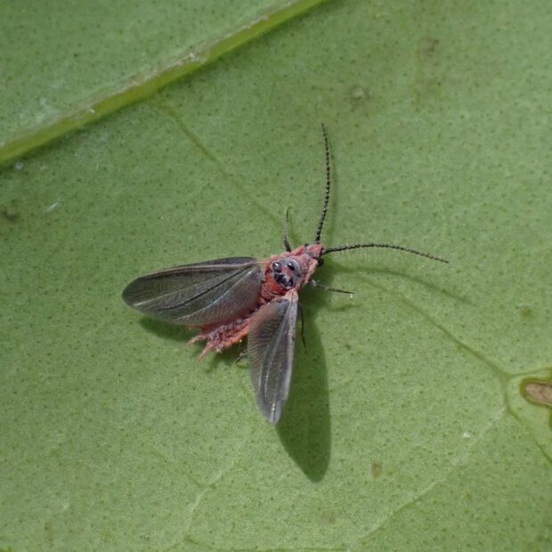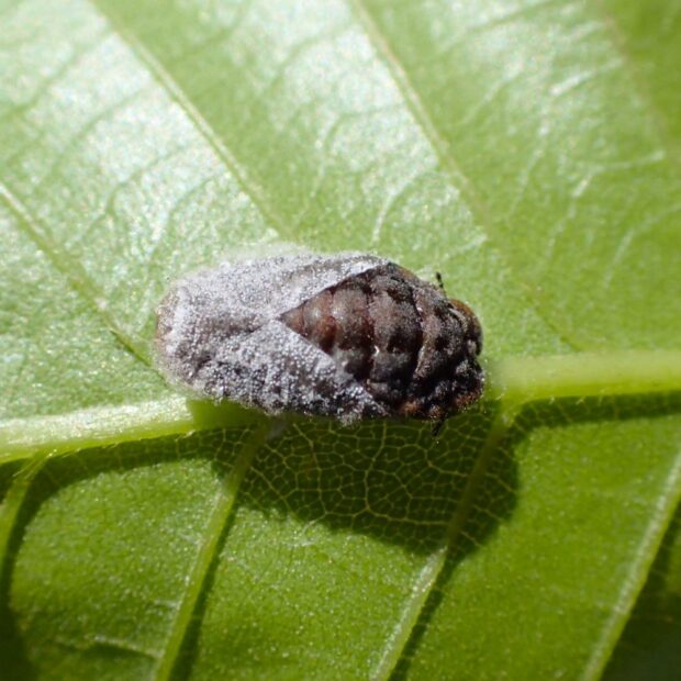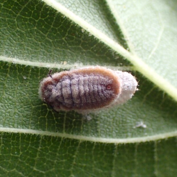 ワタフキカイガラムシの仲間。 メスはワラジ型、 体は褐色で白い粉(ロウ物質)で覆われます。 オスは、 赤い体に黒いはねをもちます。 あしをもち、 幼虫から成虫まで歩くことができます。