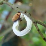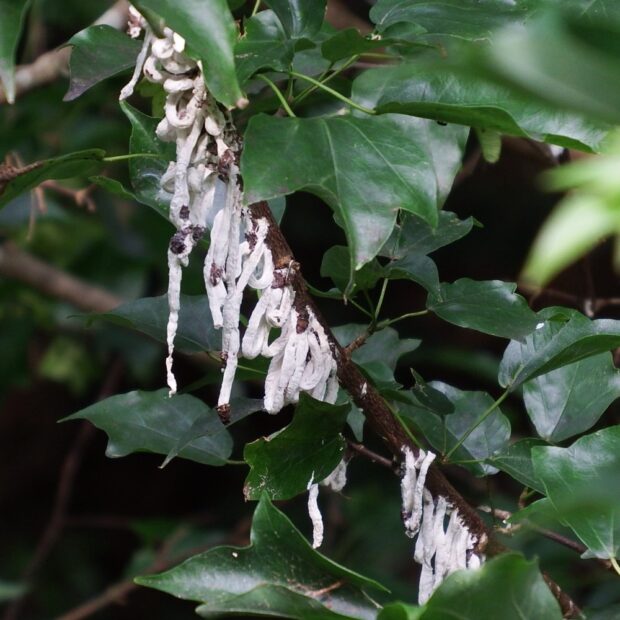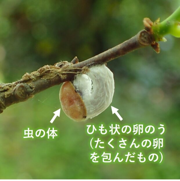 カタカイガラムシの仲間。 メスの成虫は、 茶色い部分が虫の本体で、 白いひものようなものは多数の卵を包んだ卵のうです。 オスは小さくはねがあります。 年一化性で、 5月頃見られます。 (MT)