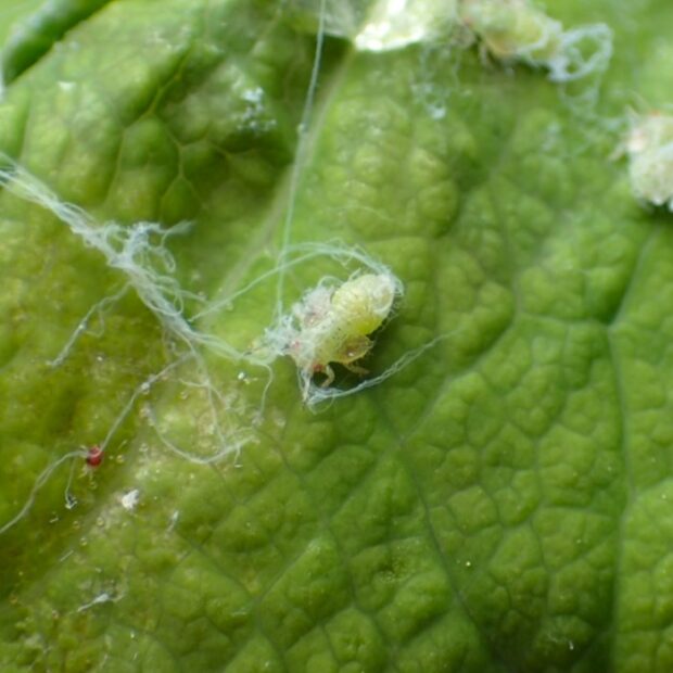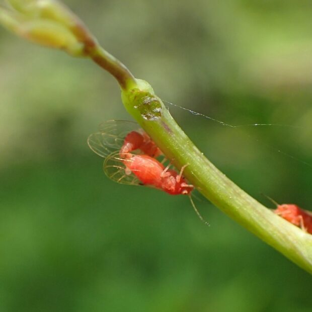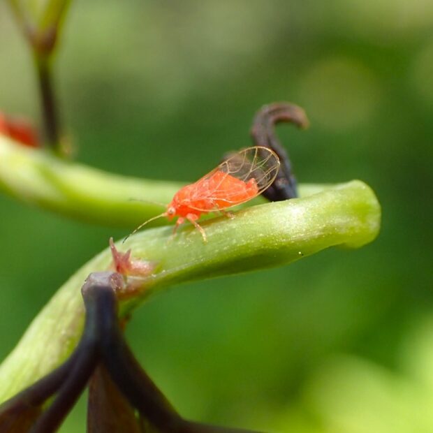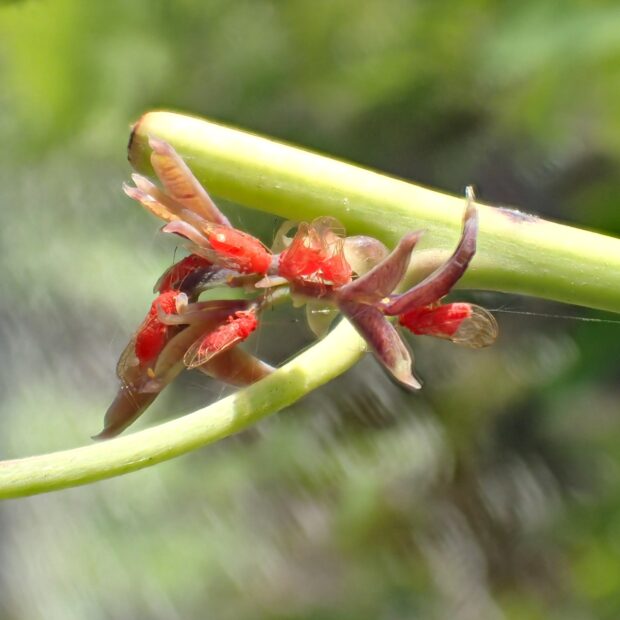 アケビにつく赤い小さなキジラミ。 キジラミとは植物の汁を吸う小さなカメムシの仲間。 幼虫は葉を二つ折りにした中で葉の汁を吸っており、 幼虫がいると葉は縮れて色が変わります。 (MT)