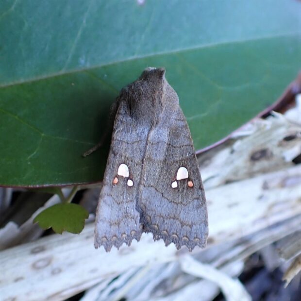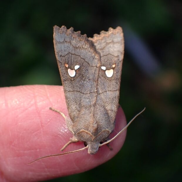秋に現れ成虫で越冬するキリガの仲間。 3つの紋がミッキーマウスに似ていることから、 「ミッキー」の愛称で親しまれています。 幼虫はエノキの葉をギョウザのように折りたたんだ中に隠れています。
