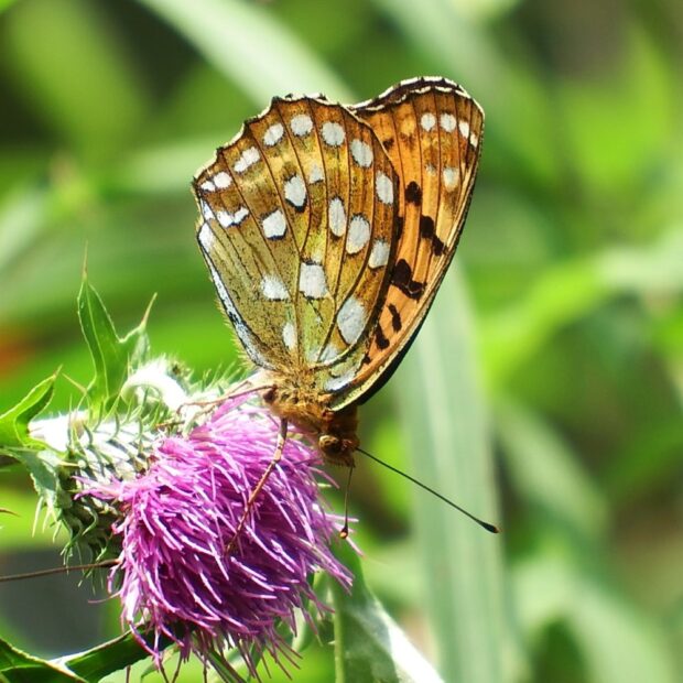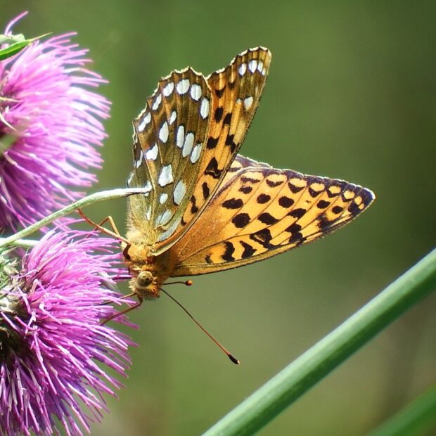 本州の中部以北の山地、 北海道では低地で見られるヒョウモンチョウの仲間。 草原のアザミの花などに蜜を吸いによくやって来ます。 (MT)